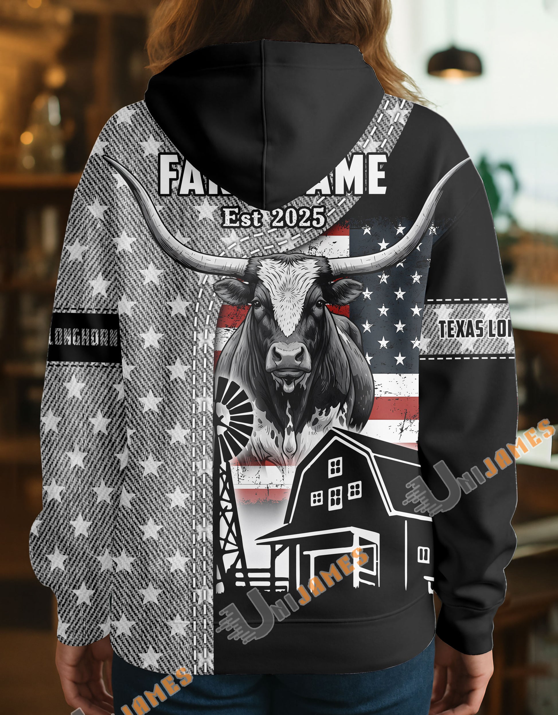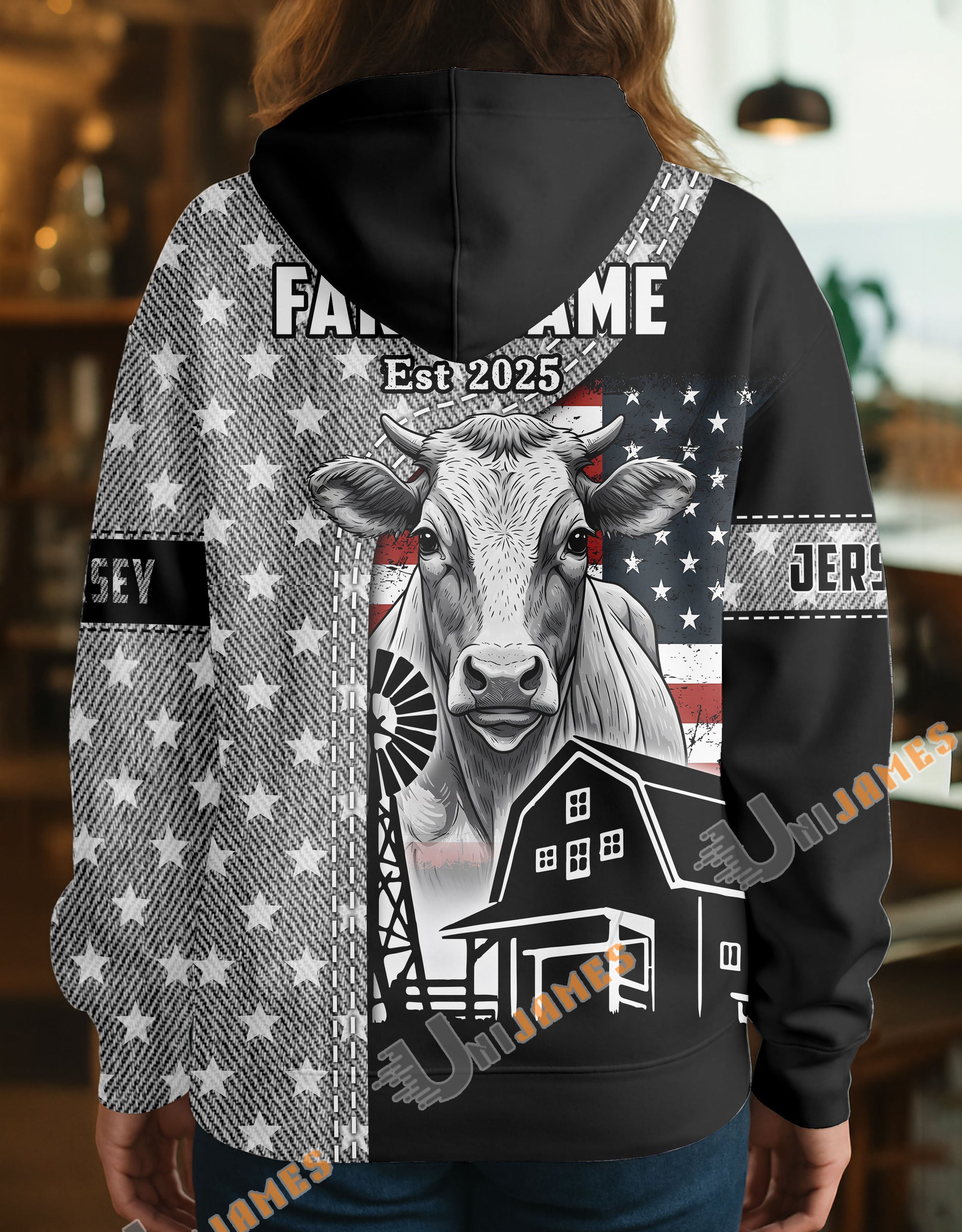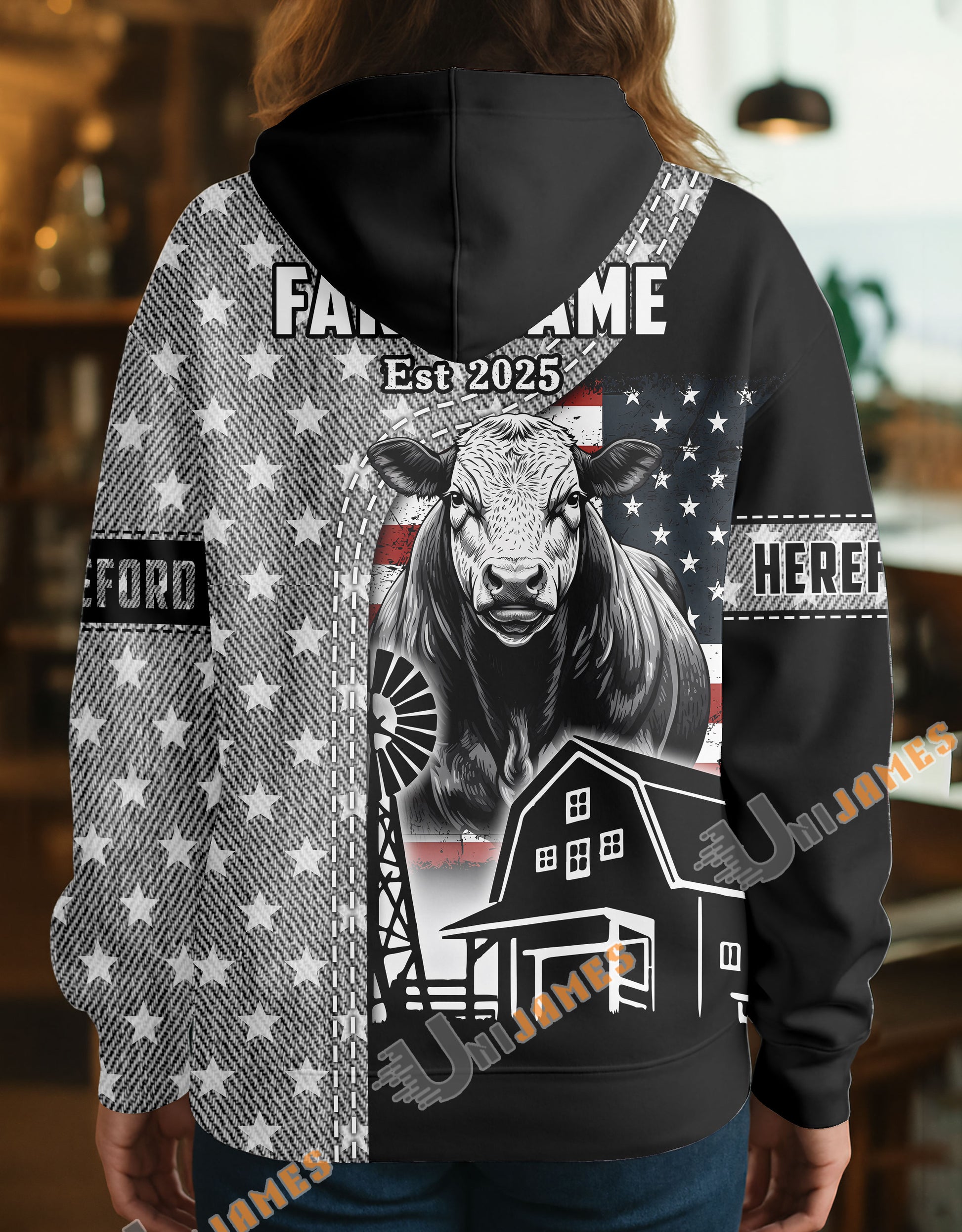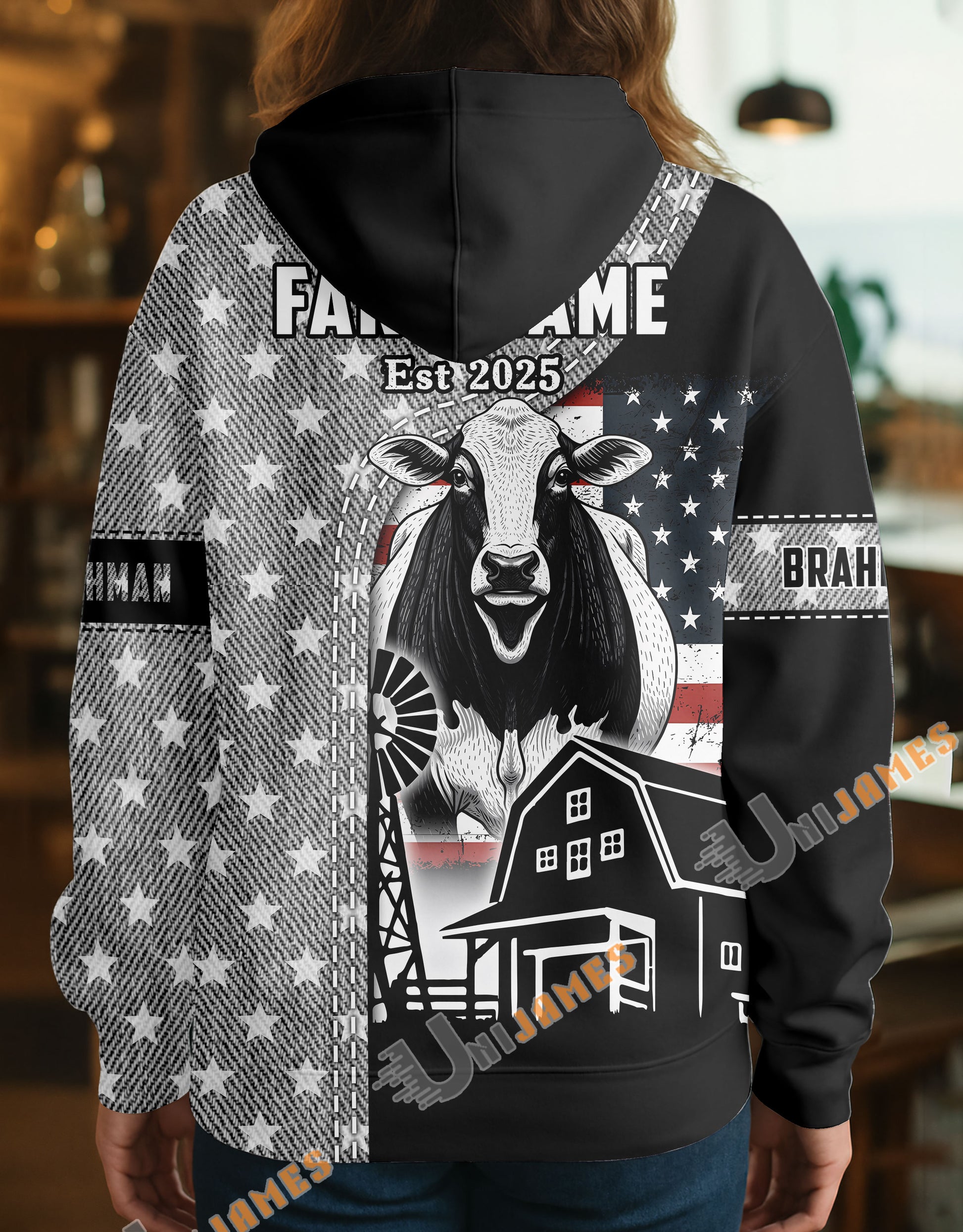Uni Personalized American Flag Ranch Pattern Name & Farm Name Cattle Hoodie
