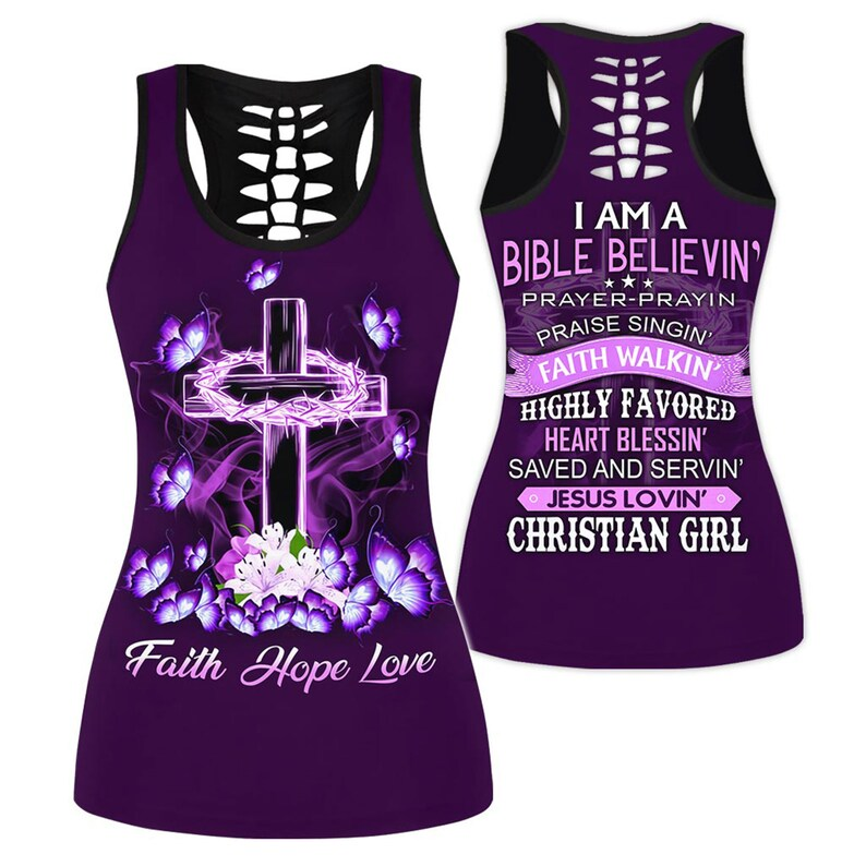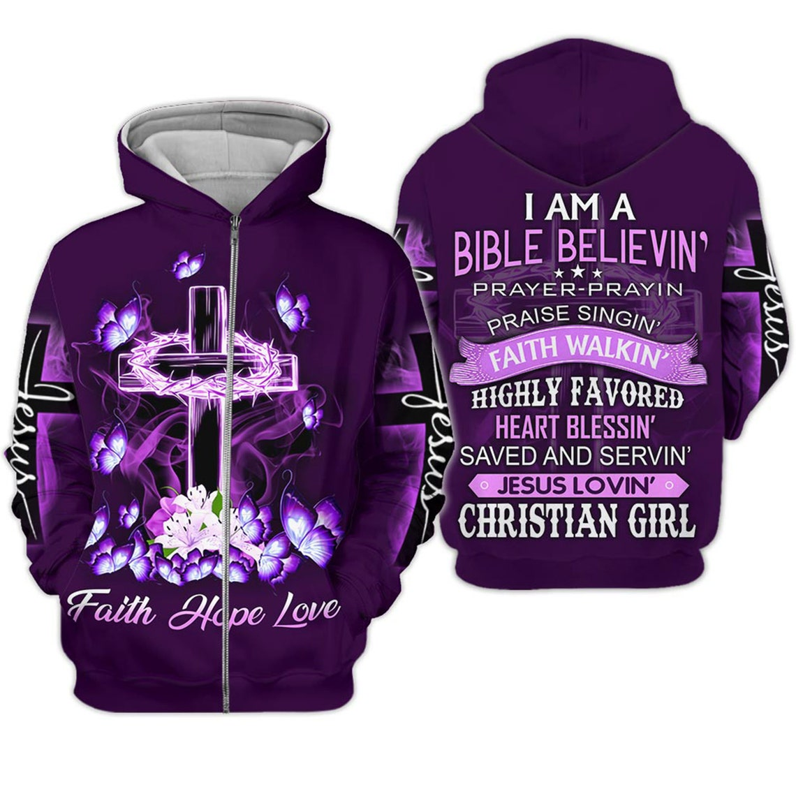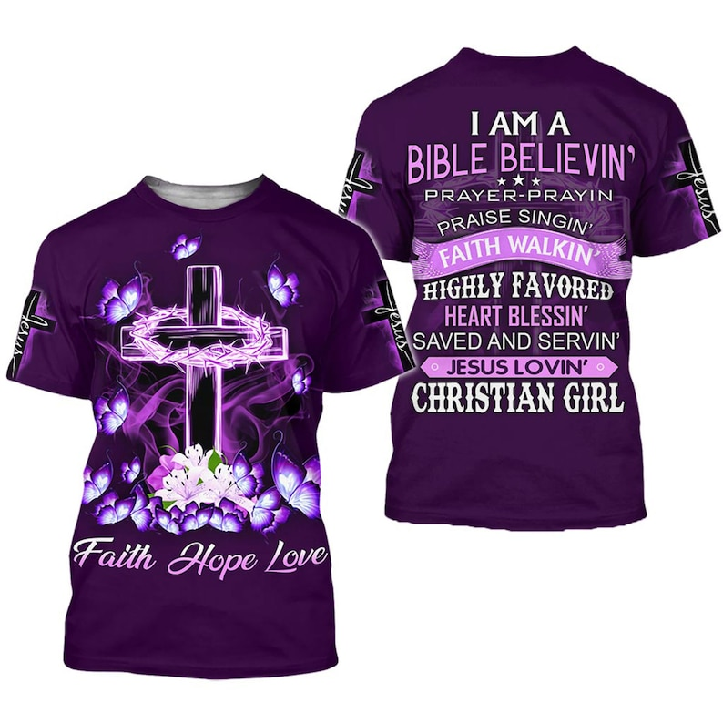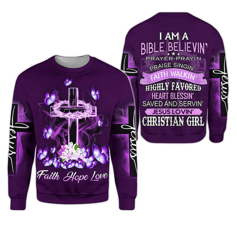 This vibrant Christian hoodie celebrates faith with a beautiful cross, glowing butterflies, and the message “Faith, Hope, Love.” The back proudly declares the joy of being a Bible-believing, Jesus-loving Christian girl. Soft, durable, and full of spiritual inspiration, it’s perfect for daily wear, worship, or sharing your faith with confidence.