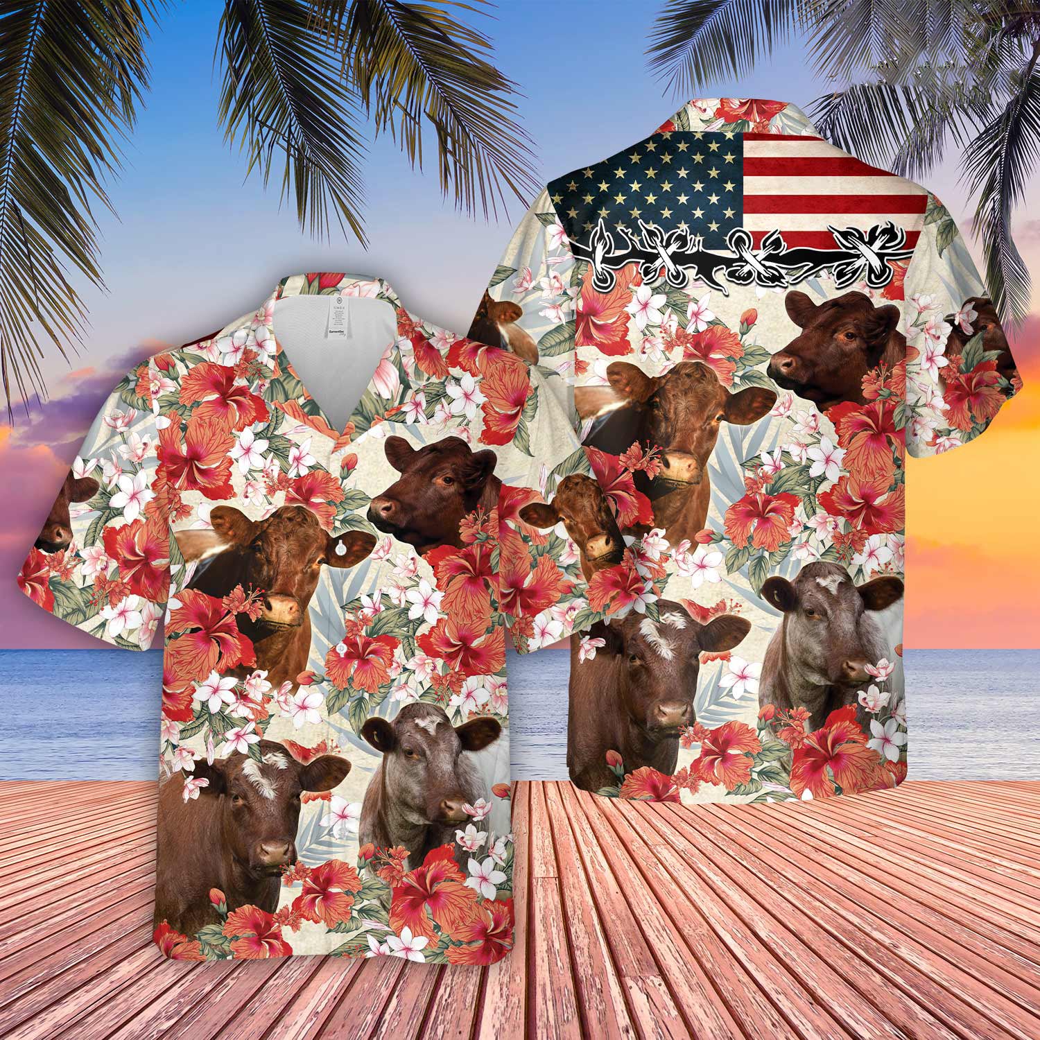 Uni Shorthorn Hibicus Floral US Flag 3D Hawaiian Shirt