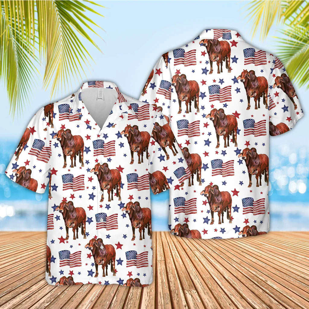 Unique Red Brahman American Flag Pattern Hawaiian Shirt