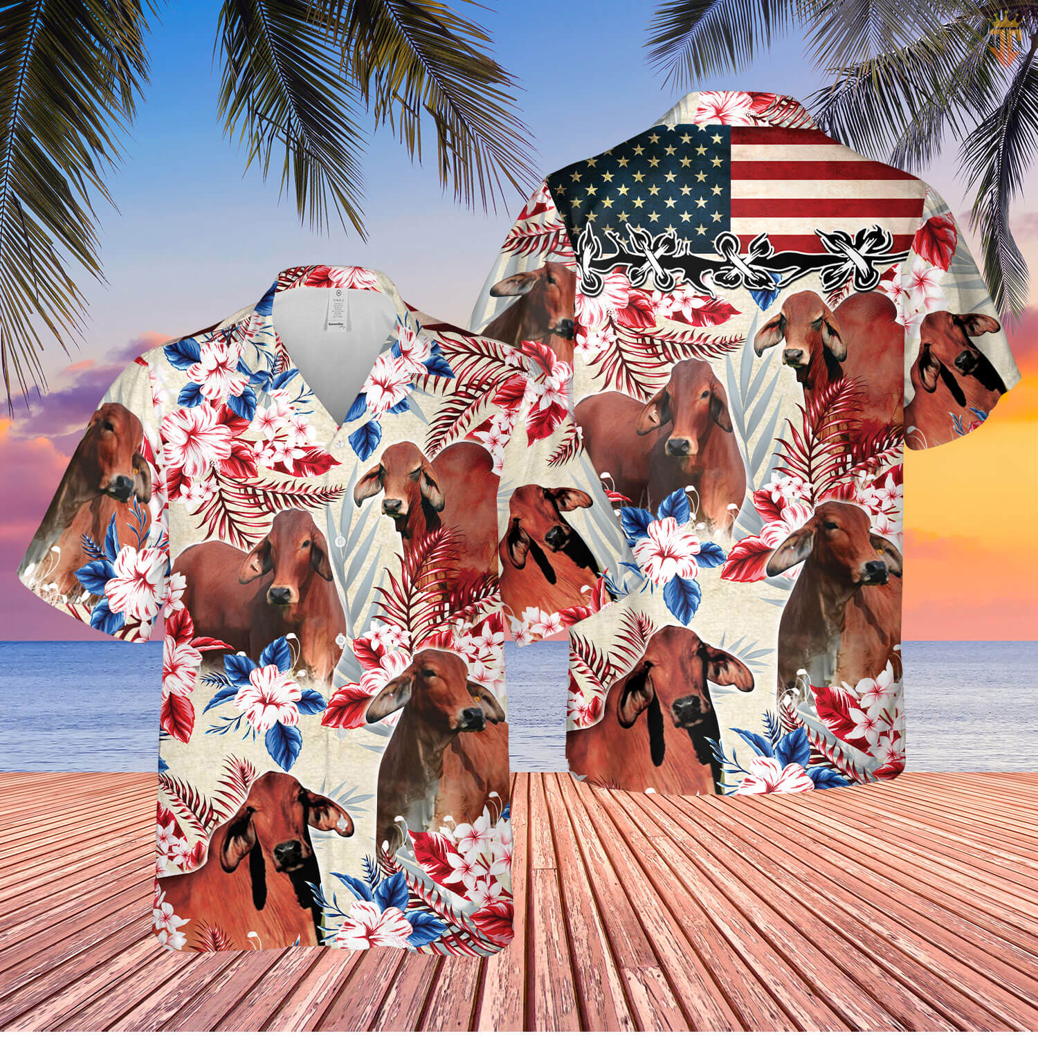 Unique Red Brahman Cattle American Flag Flowers Hawaiian Shirt