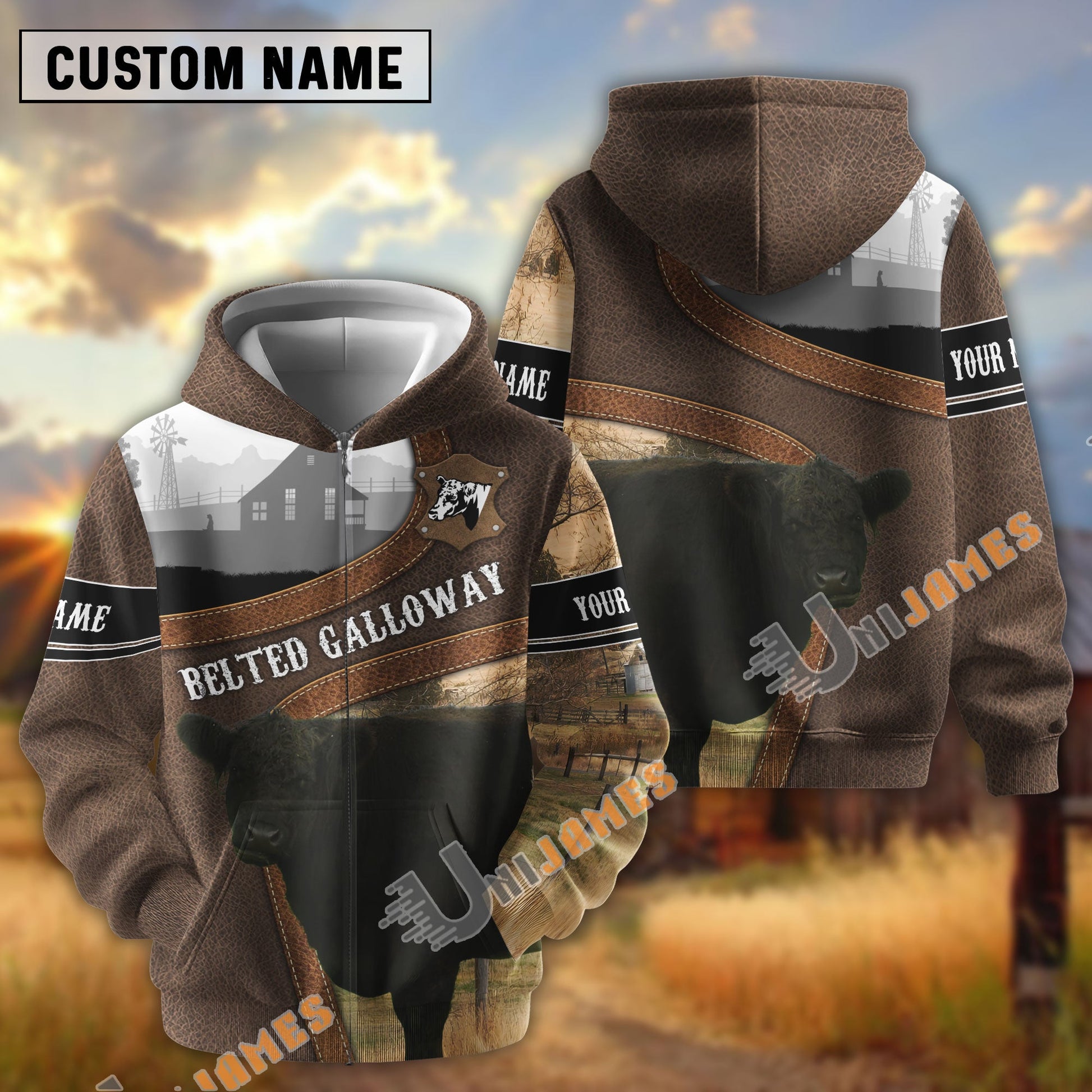 Uni Belted Galloway Light Leather Pattern Personalized Name and Farm Name Color Mixed 3D Hoodie