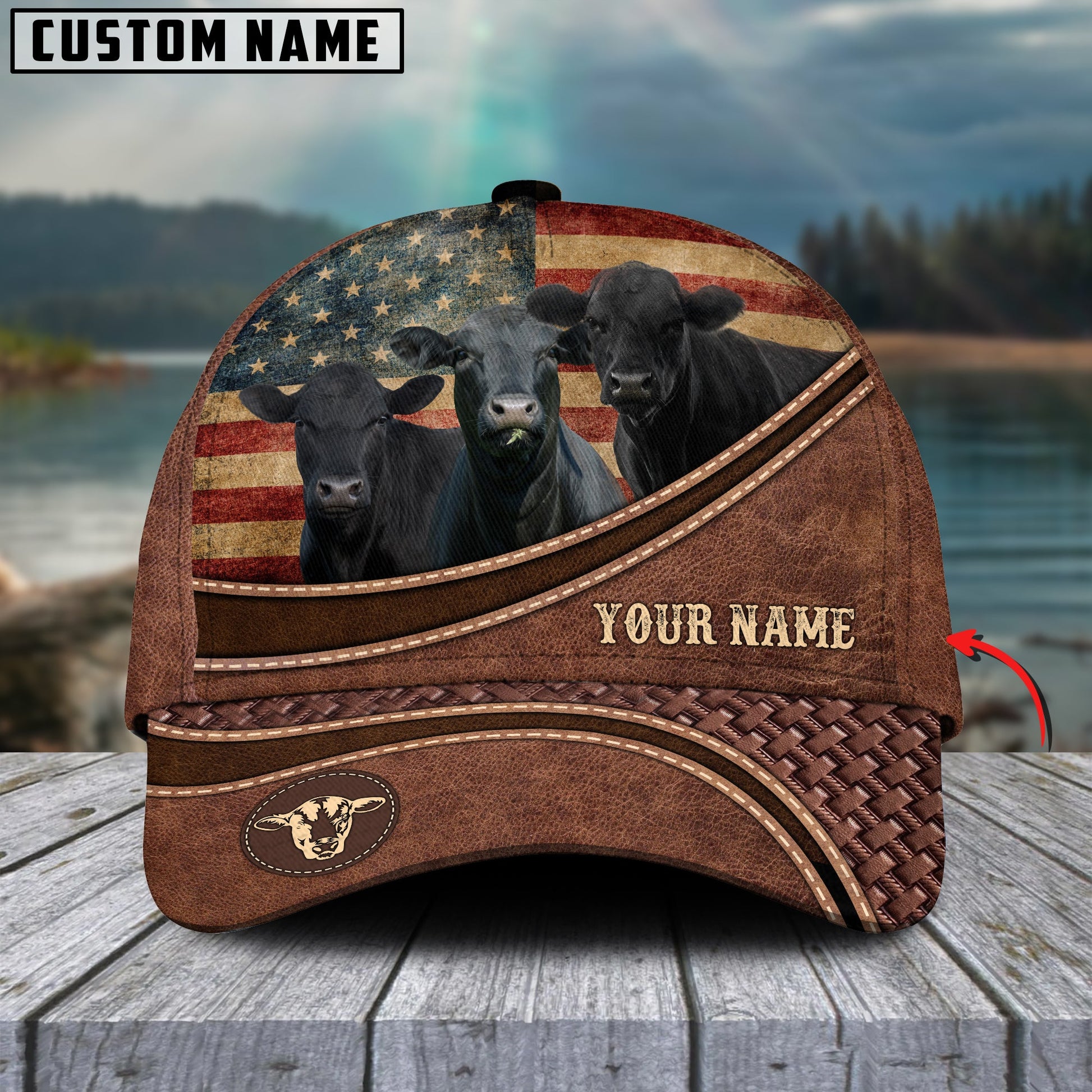 Uni Black Angus US Flag Personalized Name Brown Carving Leather Pattern Classic Cap