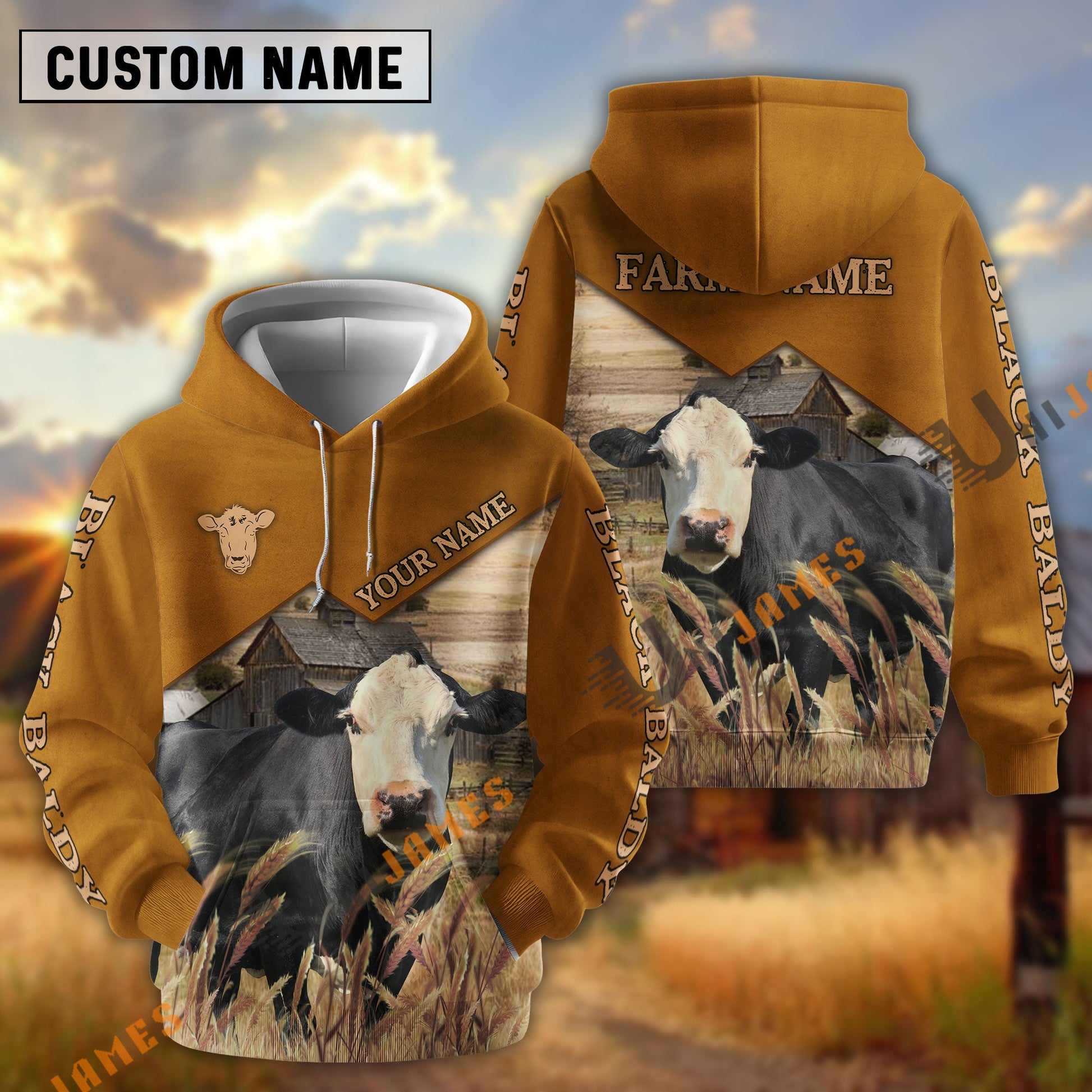 Uni Black Baldy Yellow Leather Pattern Customized Name and Farm Name 3D Hoodie