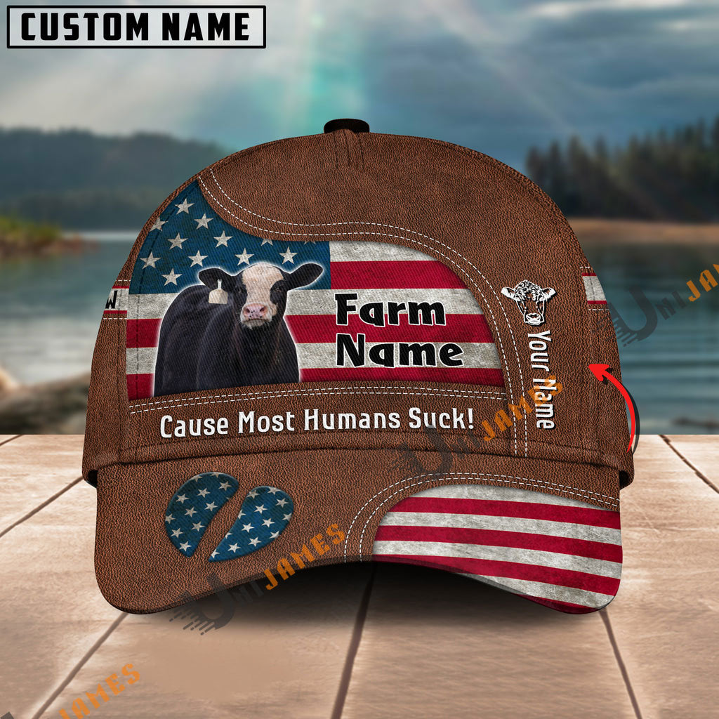 Uni Black Hereford US Flag Customized Name And Farm Name Cap