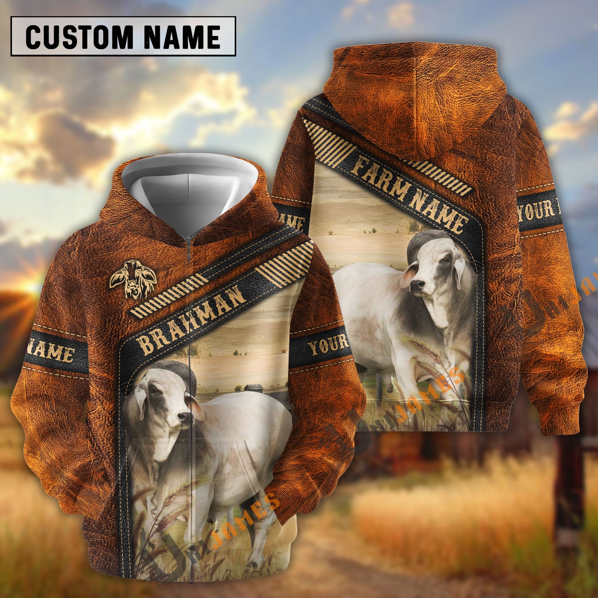 Uni Brahman Dark Leather Pattern Personalized Name and Farm Name Color Mixed 3D Hoodie