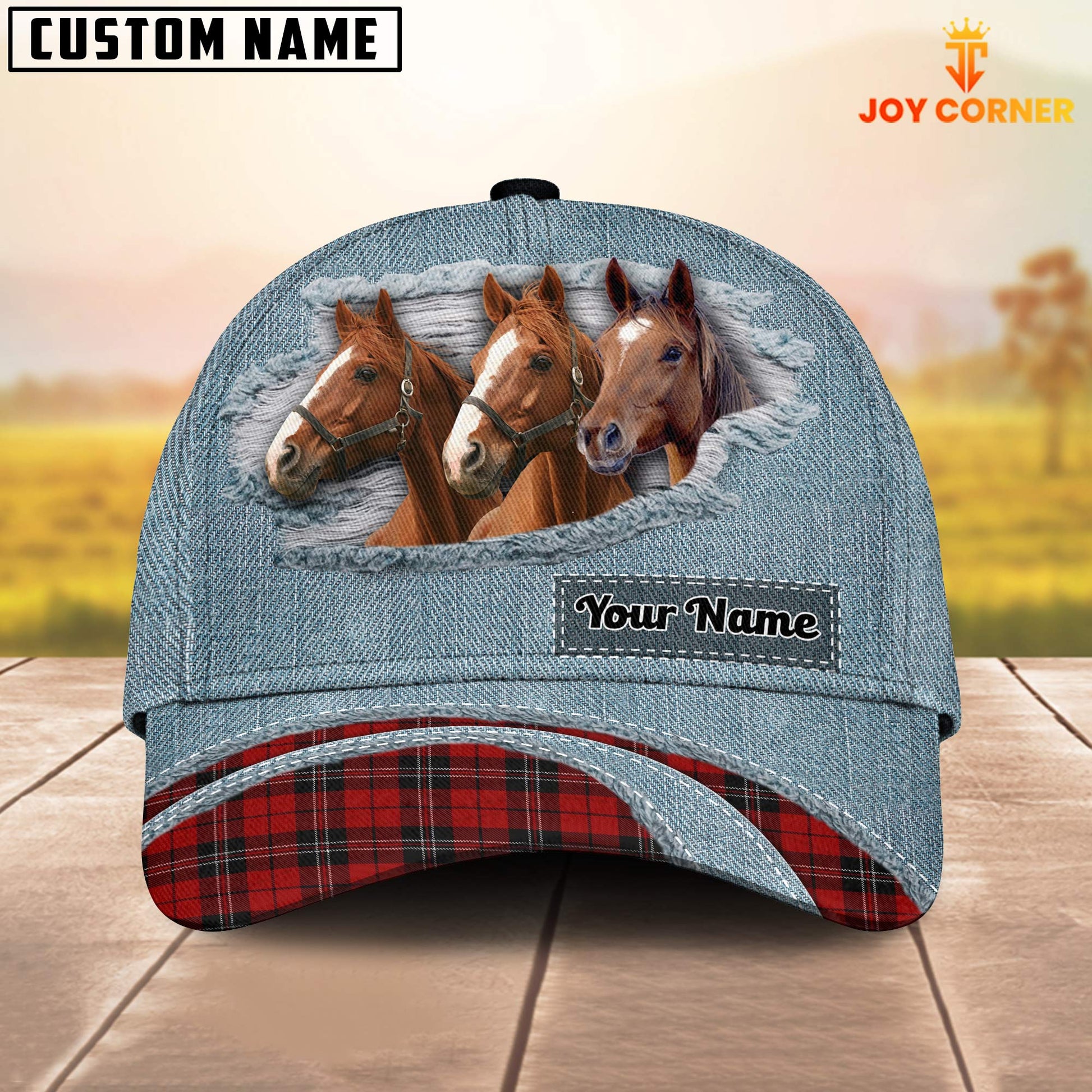 Uni Brown Horse Red Caro And Jeans Pattern Customized Name Cap