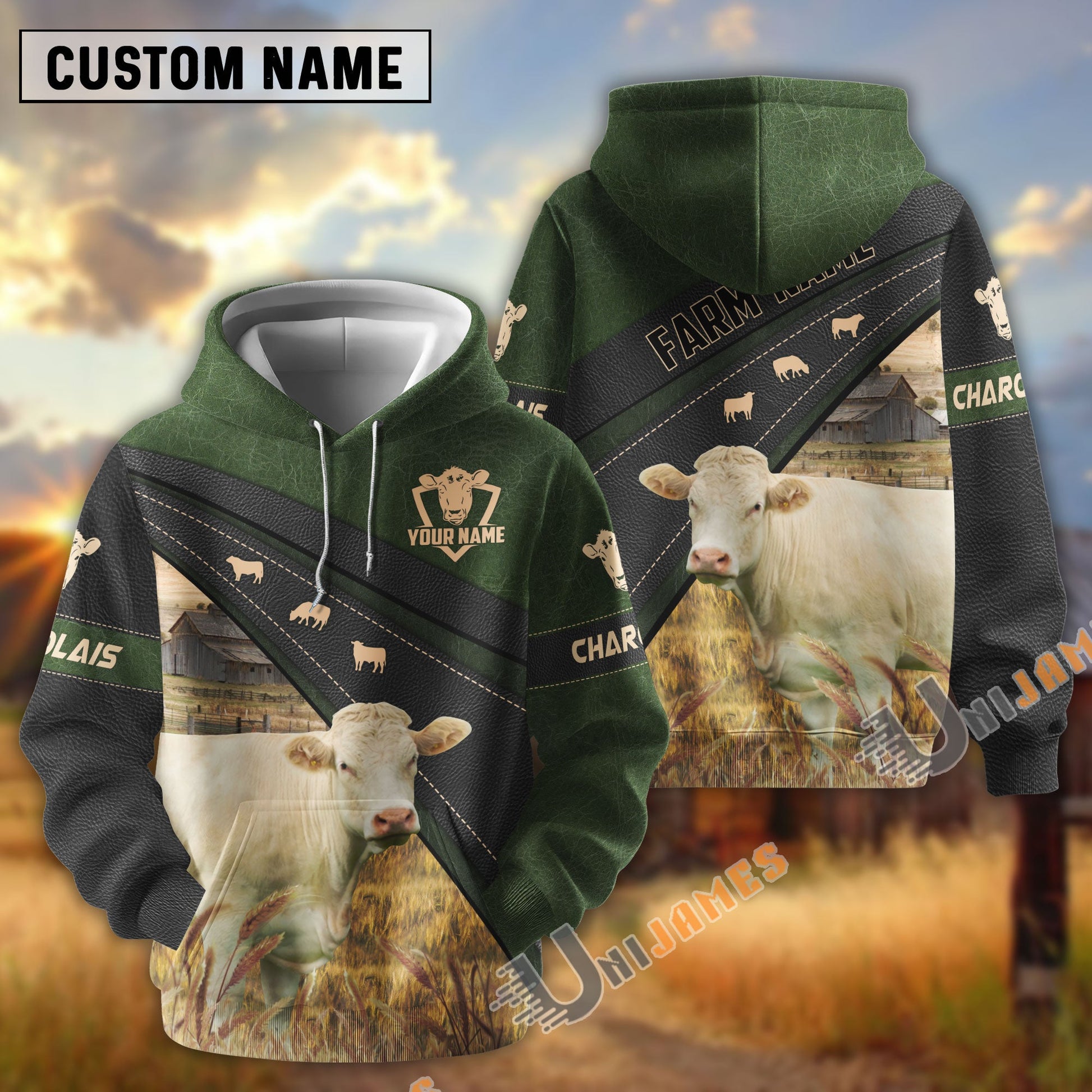 Uni Charolais Black Moss Leather Pattern Personalized Name and Farm Name Color Mixed 3D Hoodie
