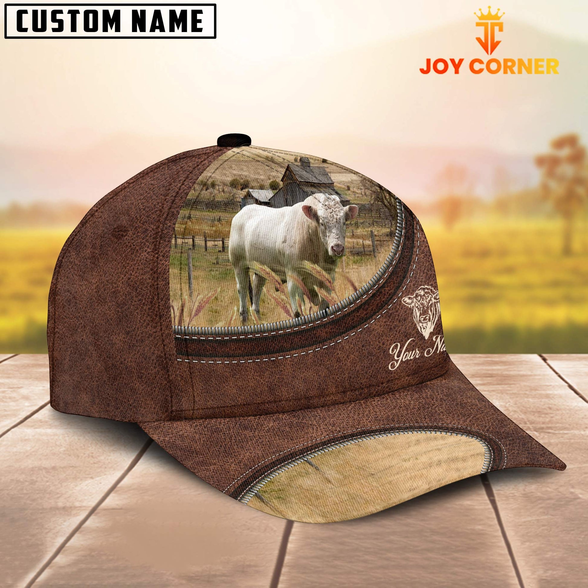 Uni Charolais Bull On The Farm Customized Name Leather Pattern Cap