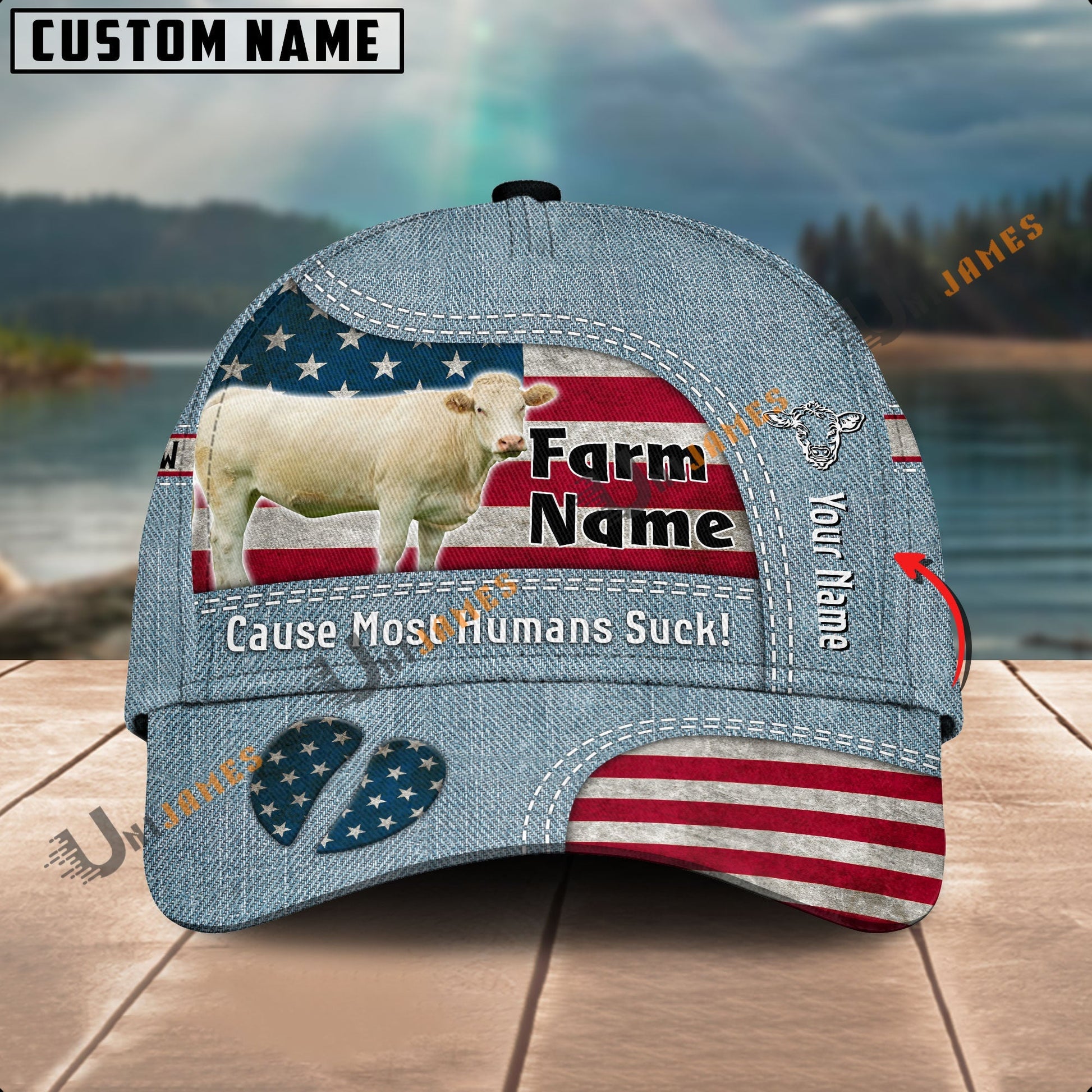 Uni Charolais US Flag Jeans Pattern Customized Name And Farm Name Cap
