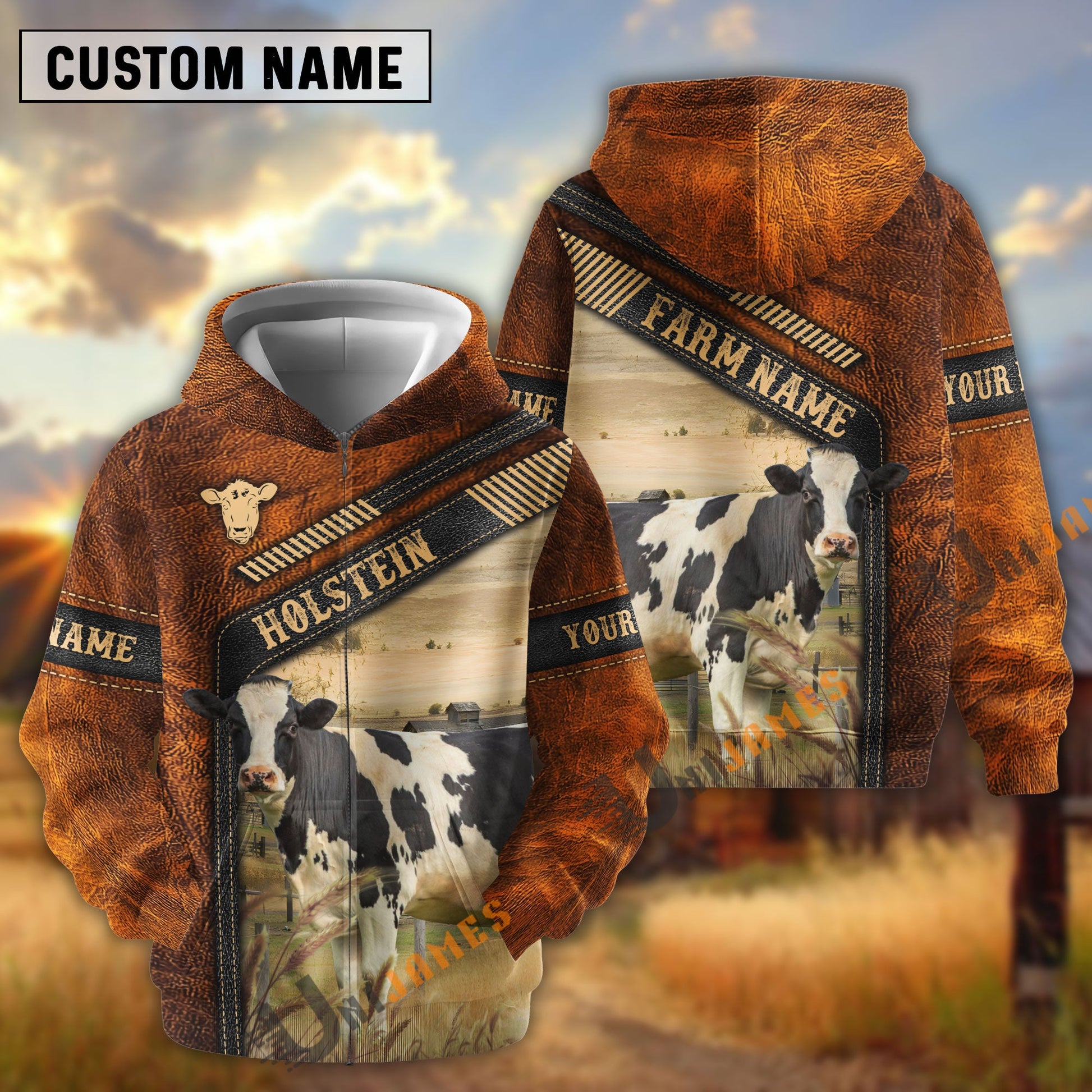 Uni Holstein Dark Leather Pattern Personalized Name and Farm Name Color Mixed 3D Hoodie