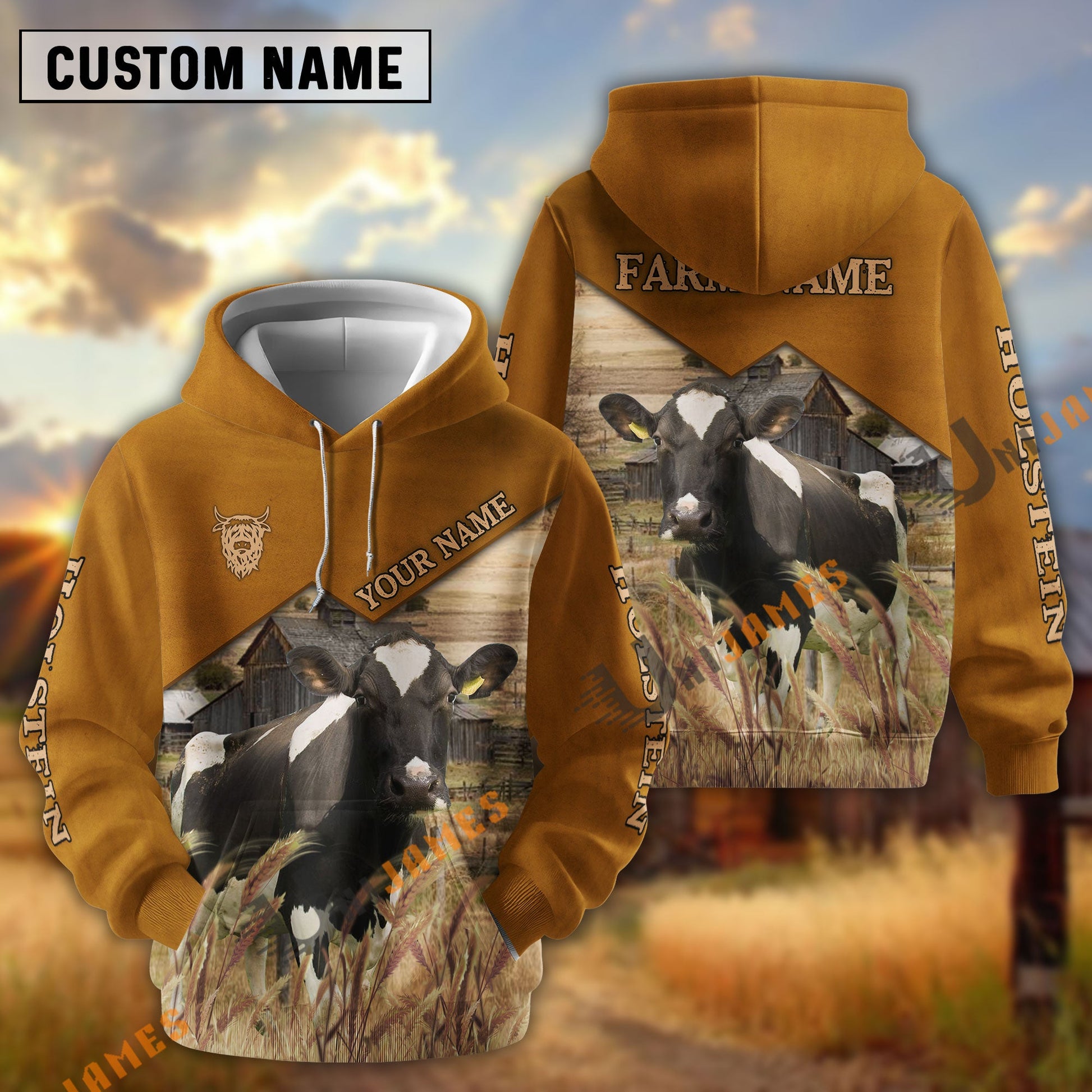 Uni Holstein Yellow Leather Pattern Customized Name and Farm Name 3D Hoodie