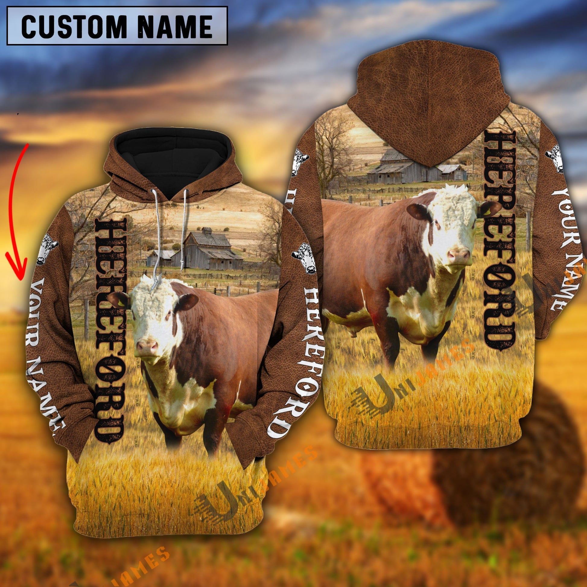 Uni Personalized Name Farm Hereford Cattle Brown Hoodie