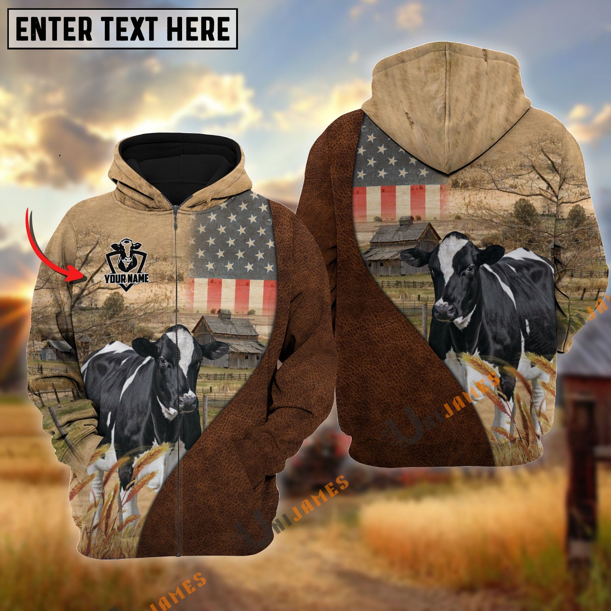 Uni Personalized Name Holstein Cattle USA Flag Hoodie