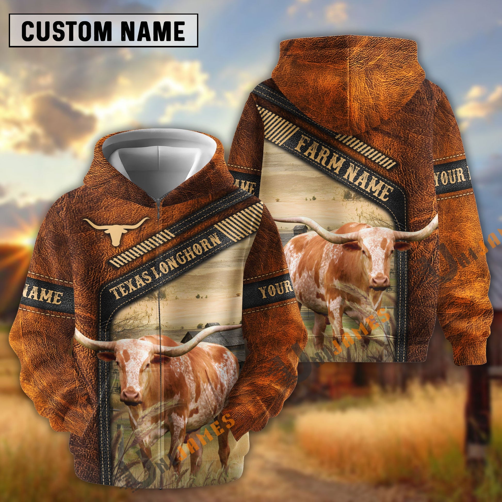 Uni Texas Longhorn Dark Leather Pattern Personalized Name and Farm Name Color Mixed 3D Hoodie