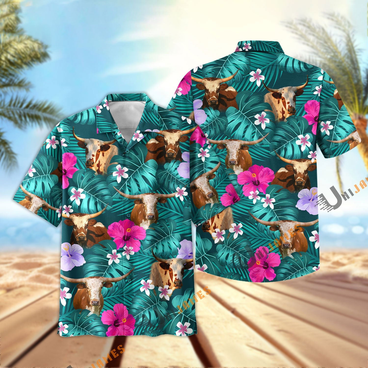 Uni Texas Longhorn Green Flowers Summer Pattern Hawaiian Shirt