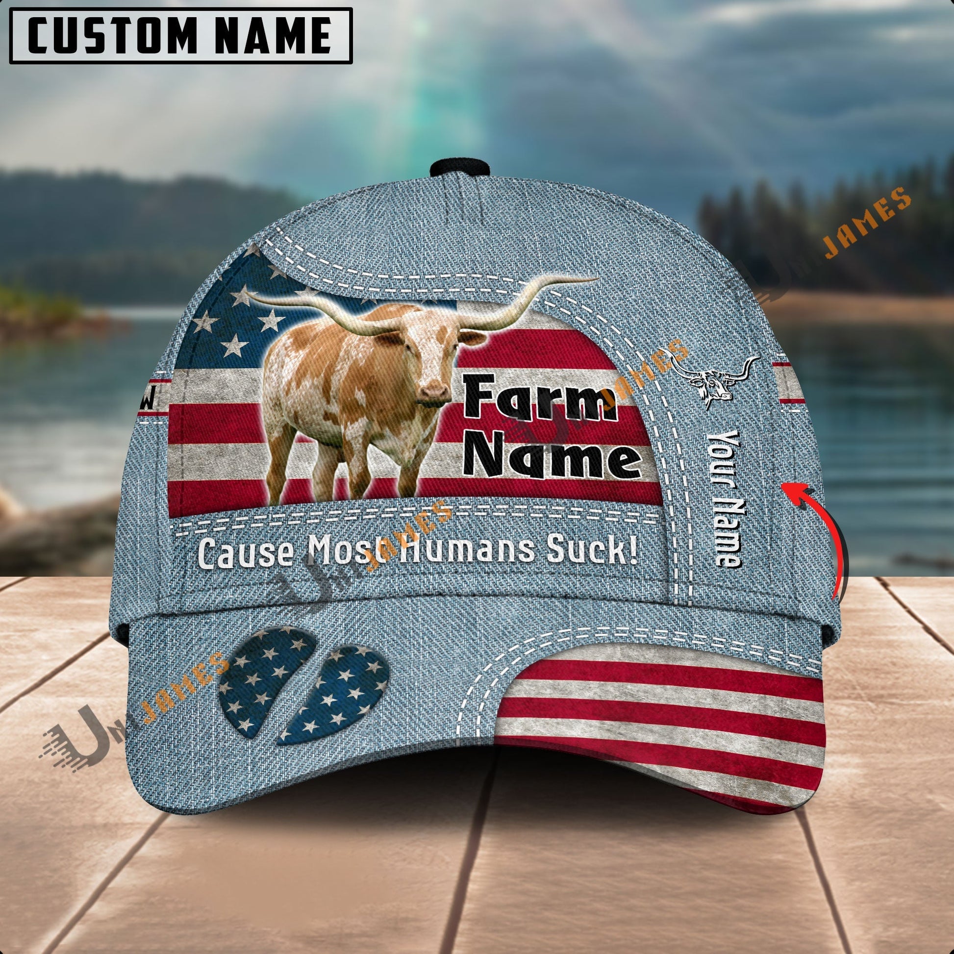 Uni Texas Longhorn US Flag Jeans Pattern Customized Name And Farm Name Cap