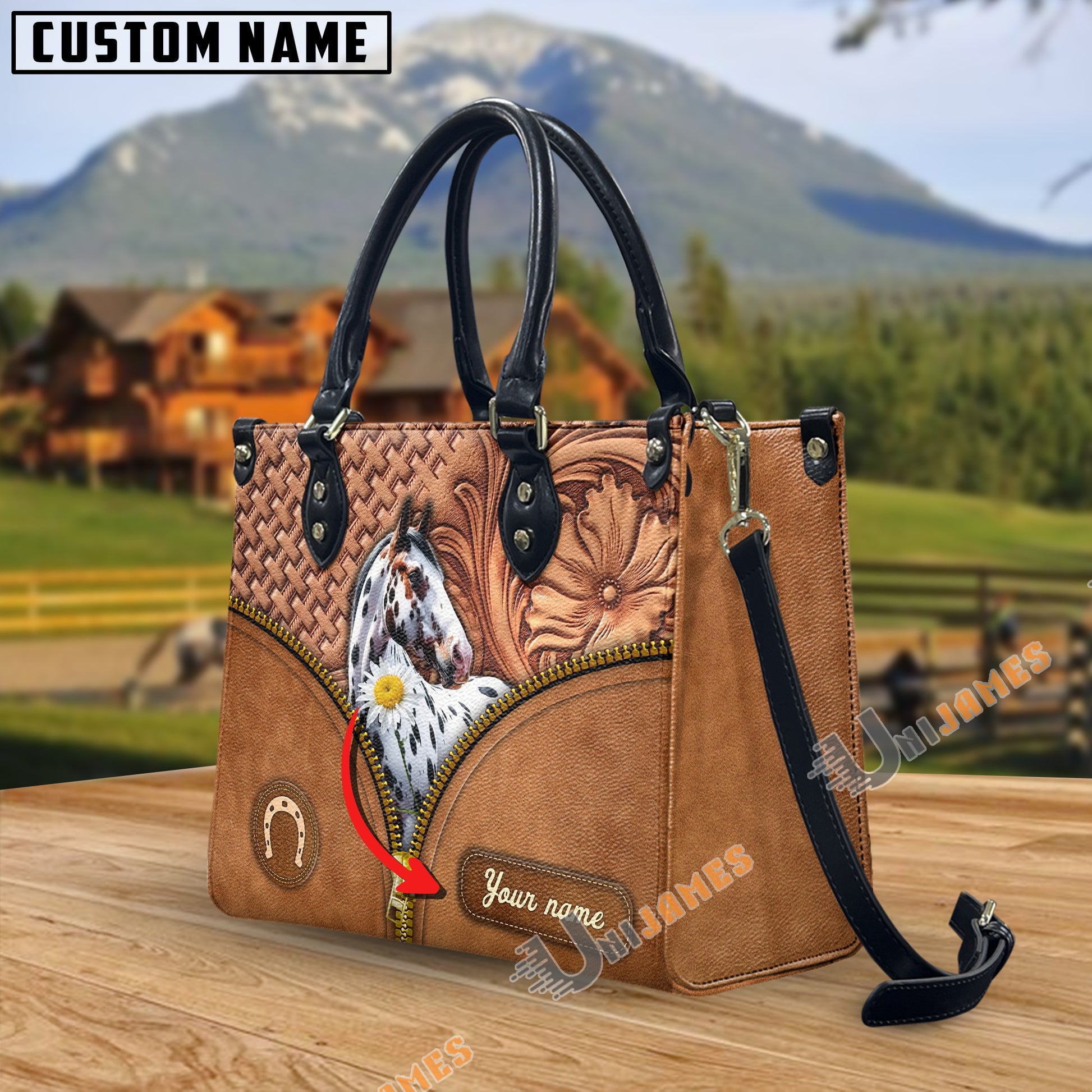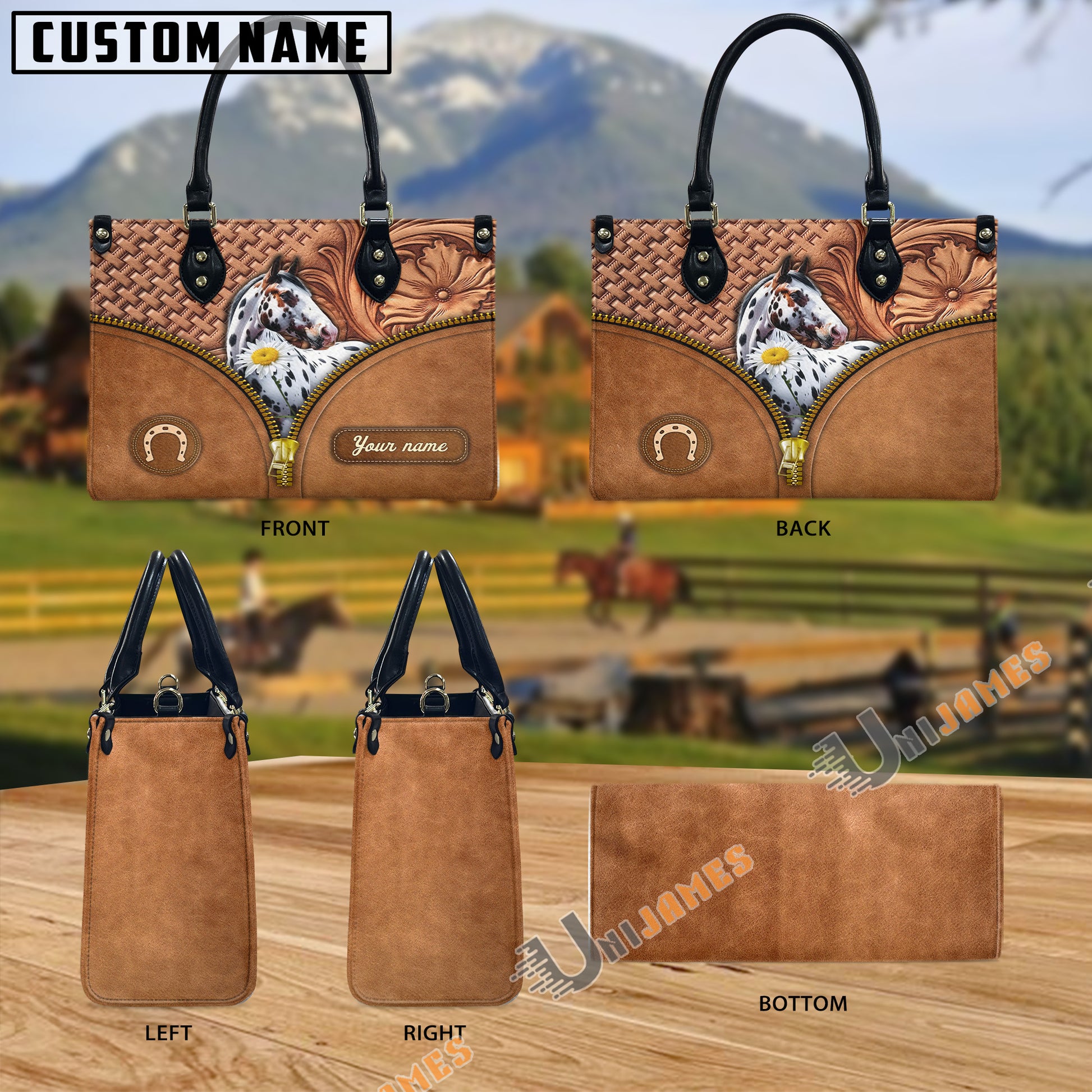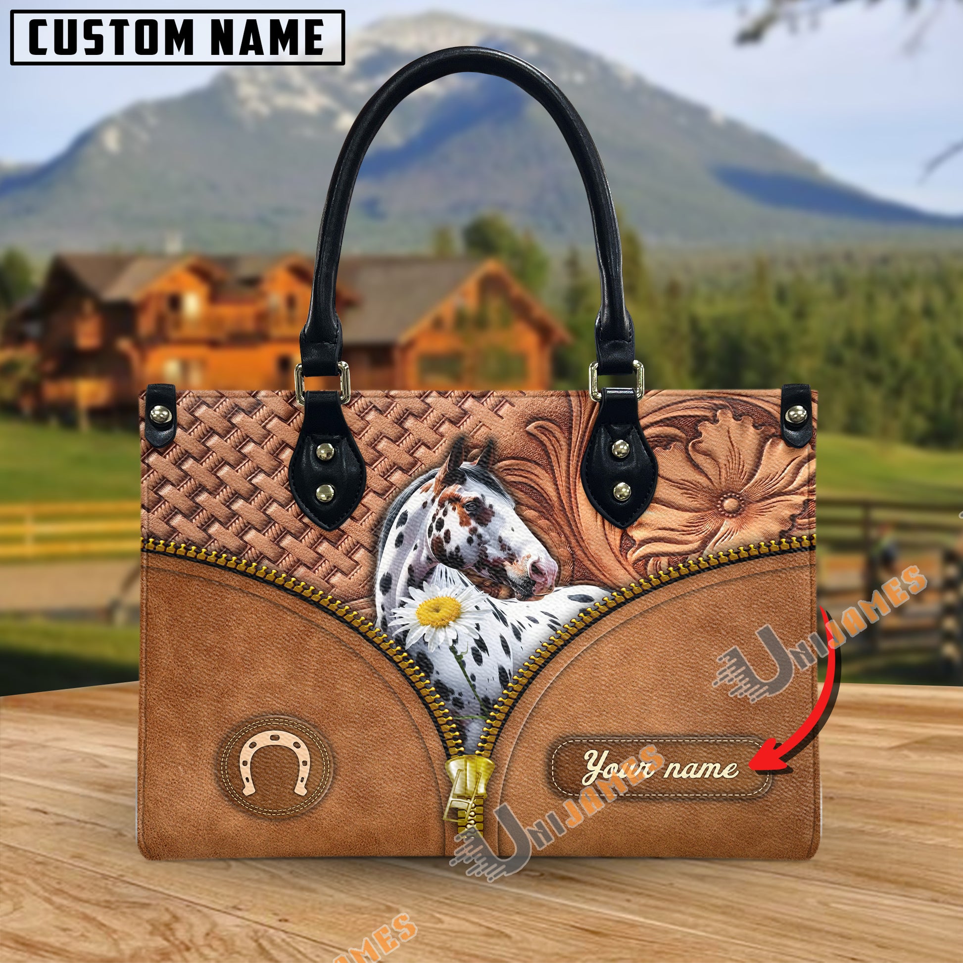Unijames Appaloosa Center Zip Pattern Custom Name 3D Leather Handbag