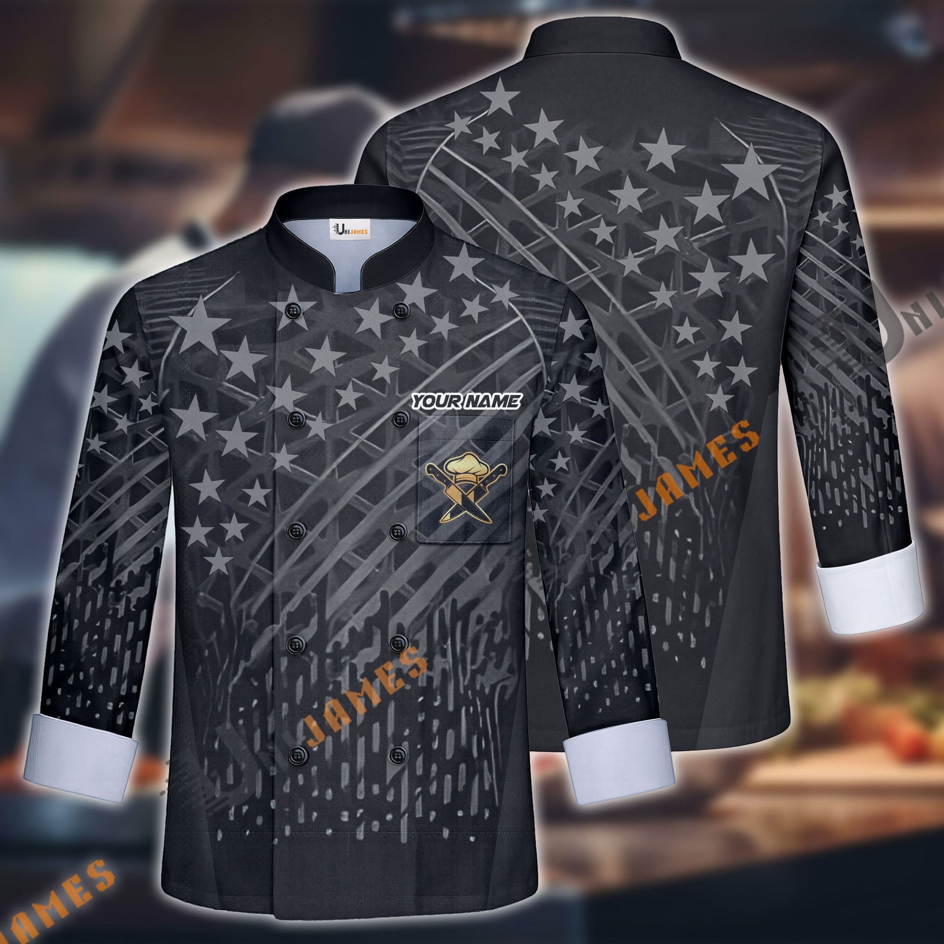 Unijames Black American Flag Custom Name Long Sleeve Chef Jacket