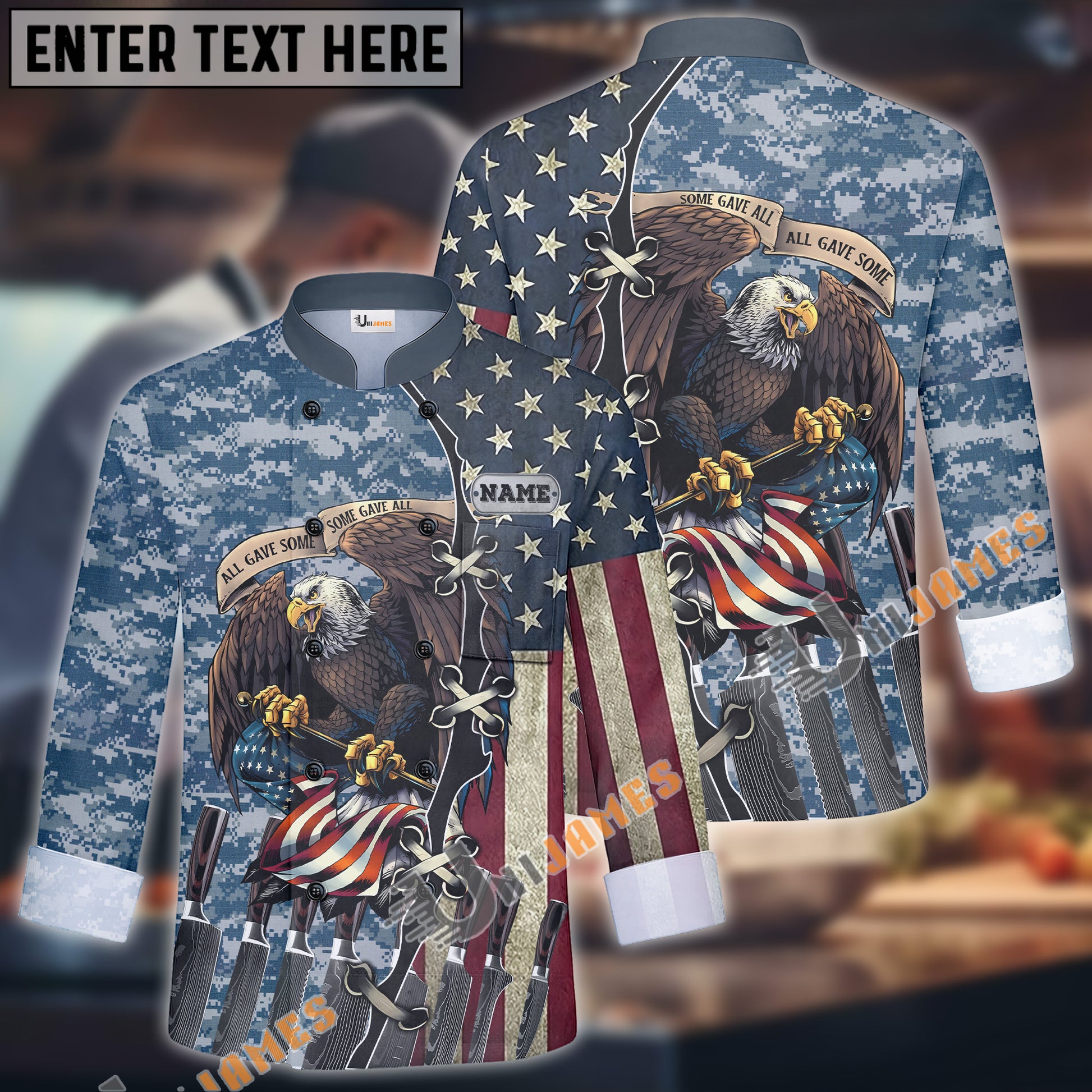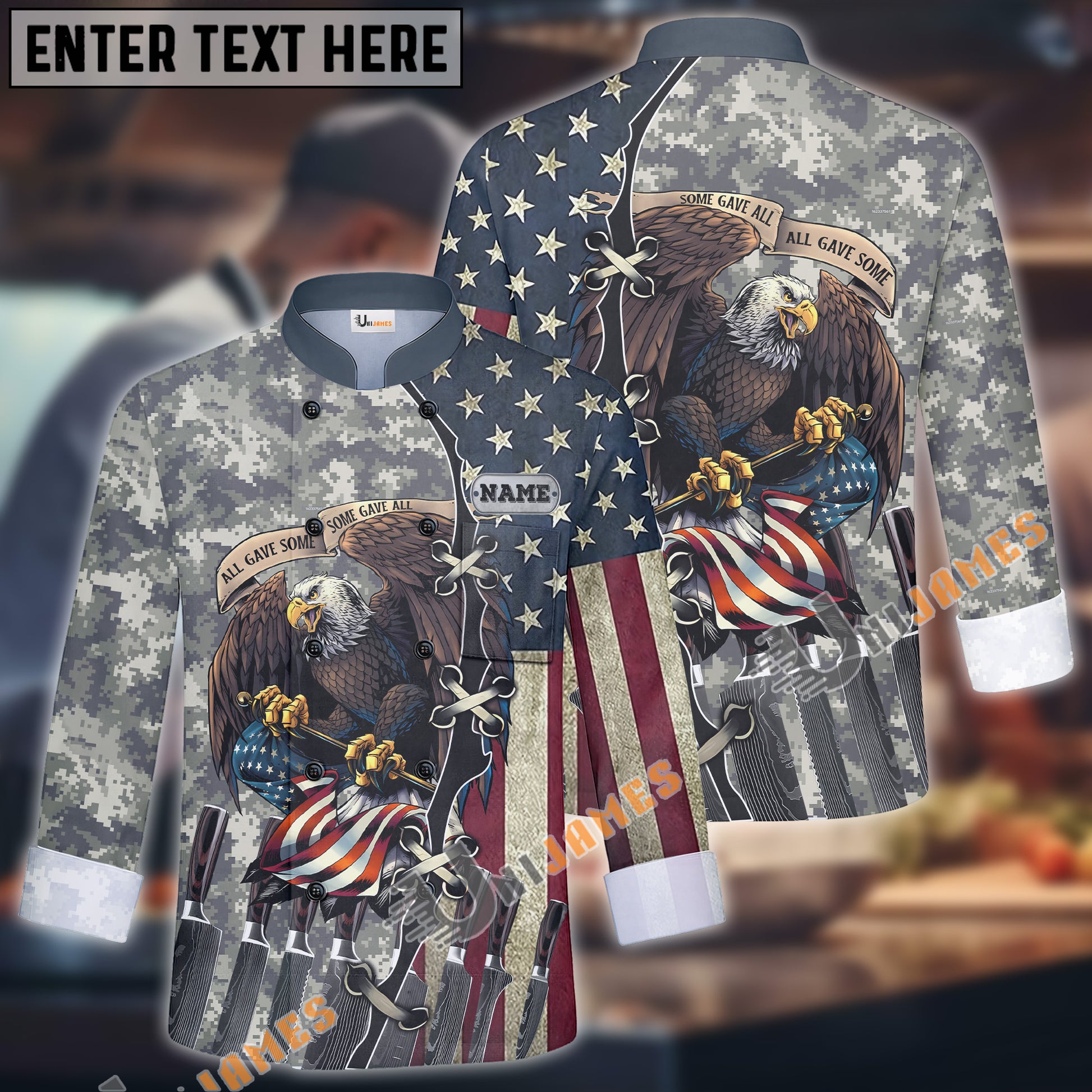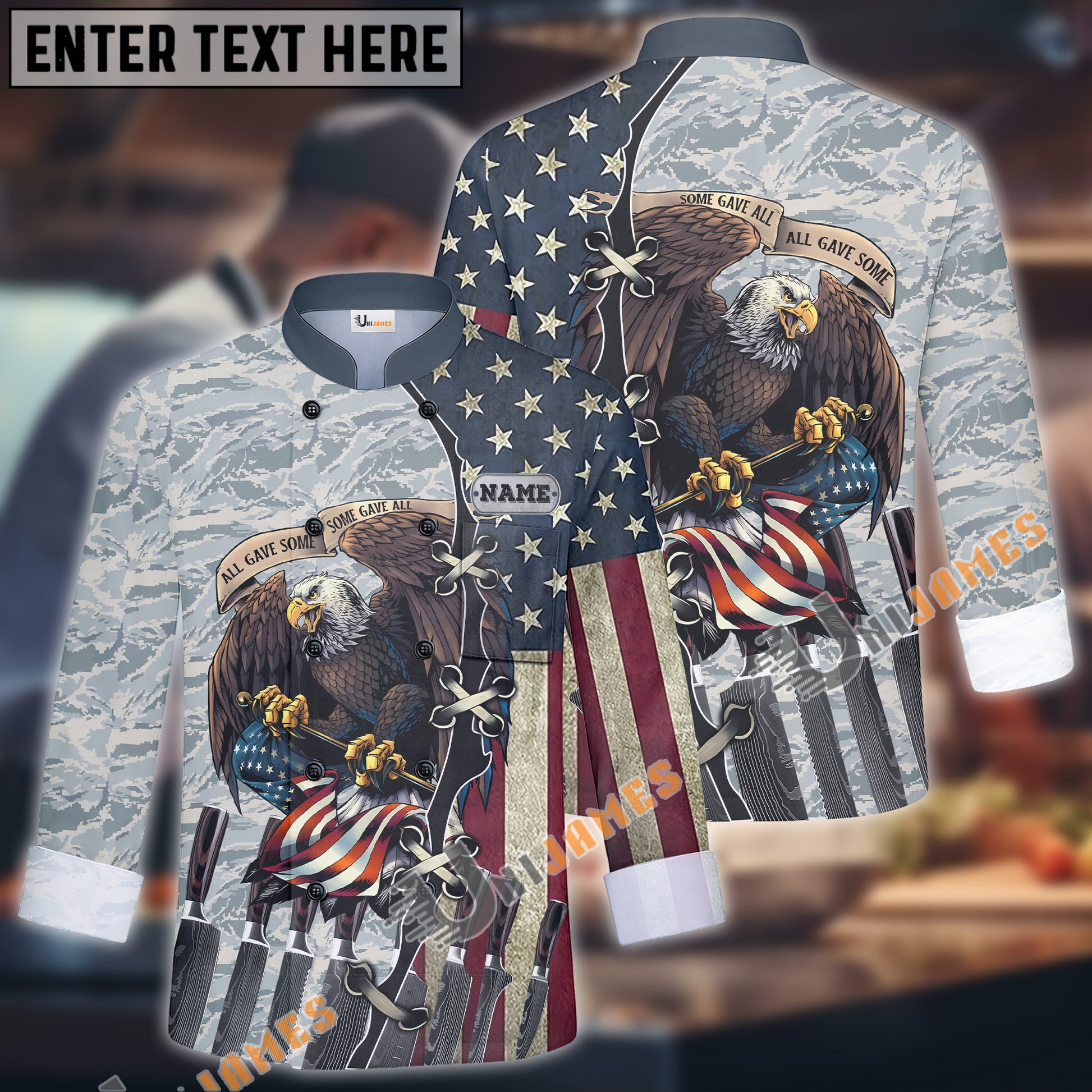 Unijames Eagle Camo Flag Multicolor Option Custom Name Long Sleeve Chef Jacket (4 Colors)