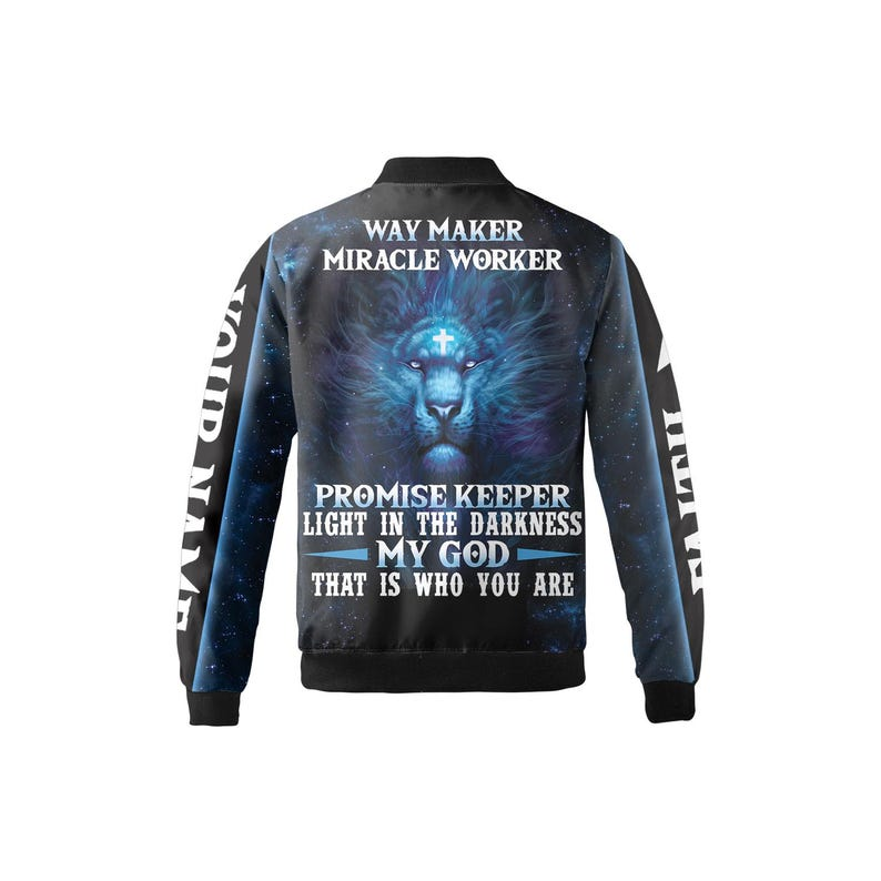 This Christian bomber jacket features a powerful Lion of Judah design with glowing cross accents and inspiring messages like “God Is My Savior” and “Way Maker, Miracle Worker.” Built for comfort and meaning, it’s a bold statement of faith for everyday wear and spiritual confidence.