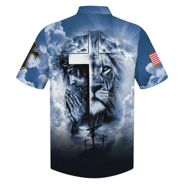 UniJames Jesus And Cross Lion Pray Hawaiian Shirt - Best Hawaiian Shirts - Christian Hawaiian Shirt