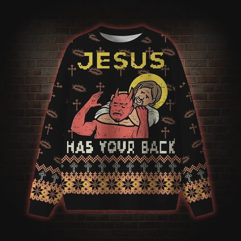 Make a bold and faith-filled statement this holiday season with our “Jesus Has Your Back” funny Christmas sweater! 🙏 This unique and eye-catching design features Jesus taking down the devil in a retro, pixel-style look — perfect for ugly sweater parties, Christian gatherings, or anyone wanting to wear their beliefs with humor and confidence. ✝️🔥