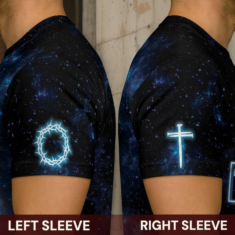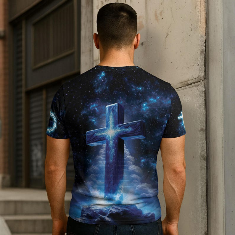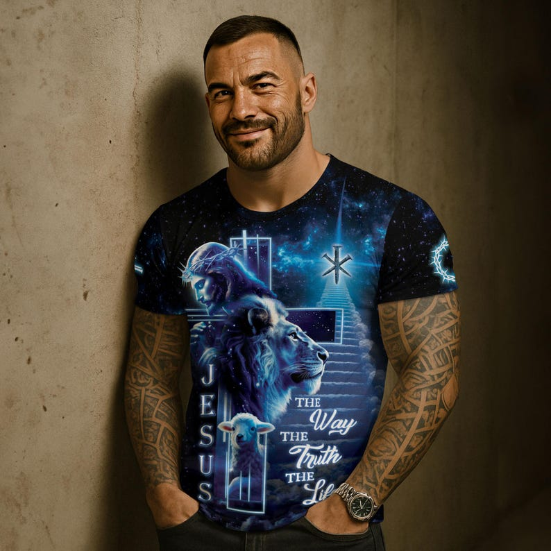 This striking Christian T-shirt features Jesus, the Lion, and the Lamb set against a radiant celestial backdrop. With the powerful message “The Way, The Truth, The Life,” it reminds believers of Christ’s guidance and eternal hope. A bold, faith-filled design perfect for daily wear, worship, and meaningful expression.