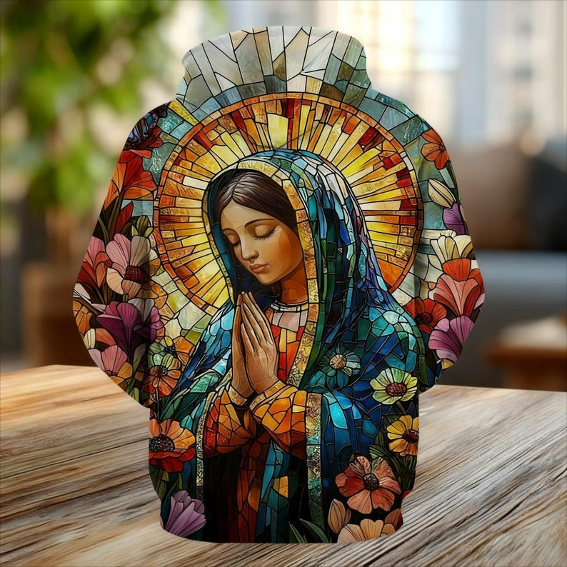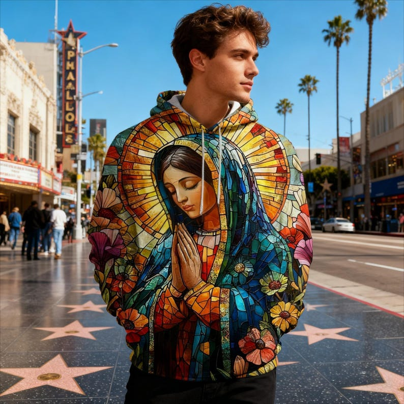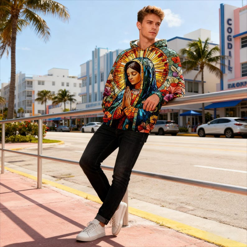 Crafted with meticulous attention to detail, the hoodie features a high-definition all-over print that captures the radiant colors and luminous textures of stained glass. The artwork wraps naturally around the body, creating a striking visual that feels both uplifting and contemporary. Whether you're walking through the city or elevating your casual wardrobe, this piece brings unmatched presence and personality.