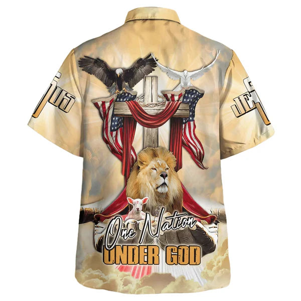 UniJames One Nation Under God America Flag Lion And The Lamb Jesus Hawaiian Shirt - Best Hawaiian Shirts - Christian Hawaiian Shirt