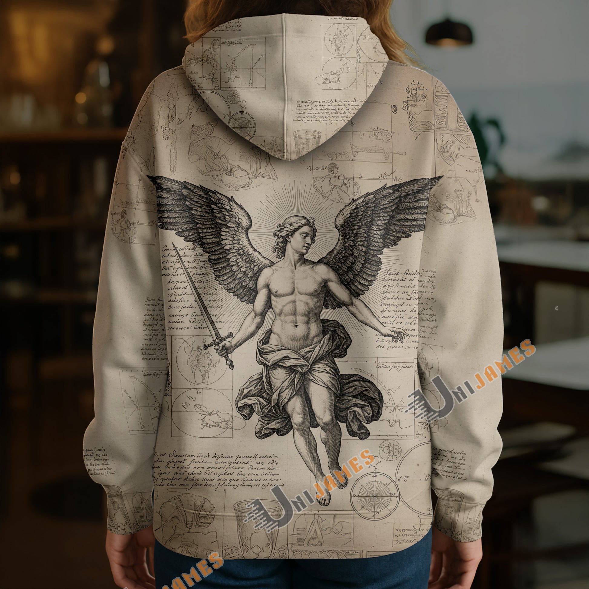 This hoodie presents the archangel as a symbol of strength, judgment, and protection. Set against classical sketches and sacred geometry, the design reflects the eternal tension between wisdom and power. A piece inspired by divine order and moral clarity, created for those who seek purpose beyond the visible.