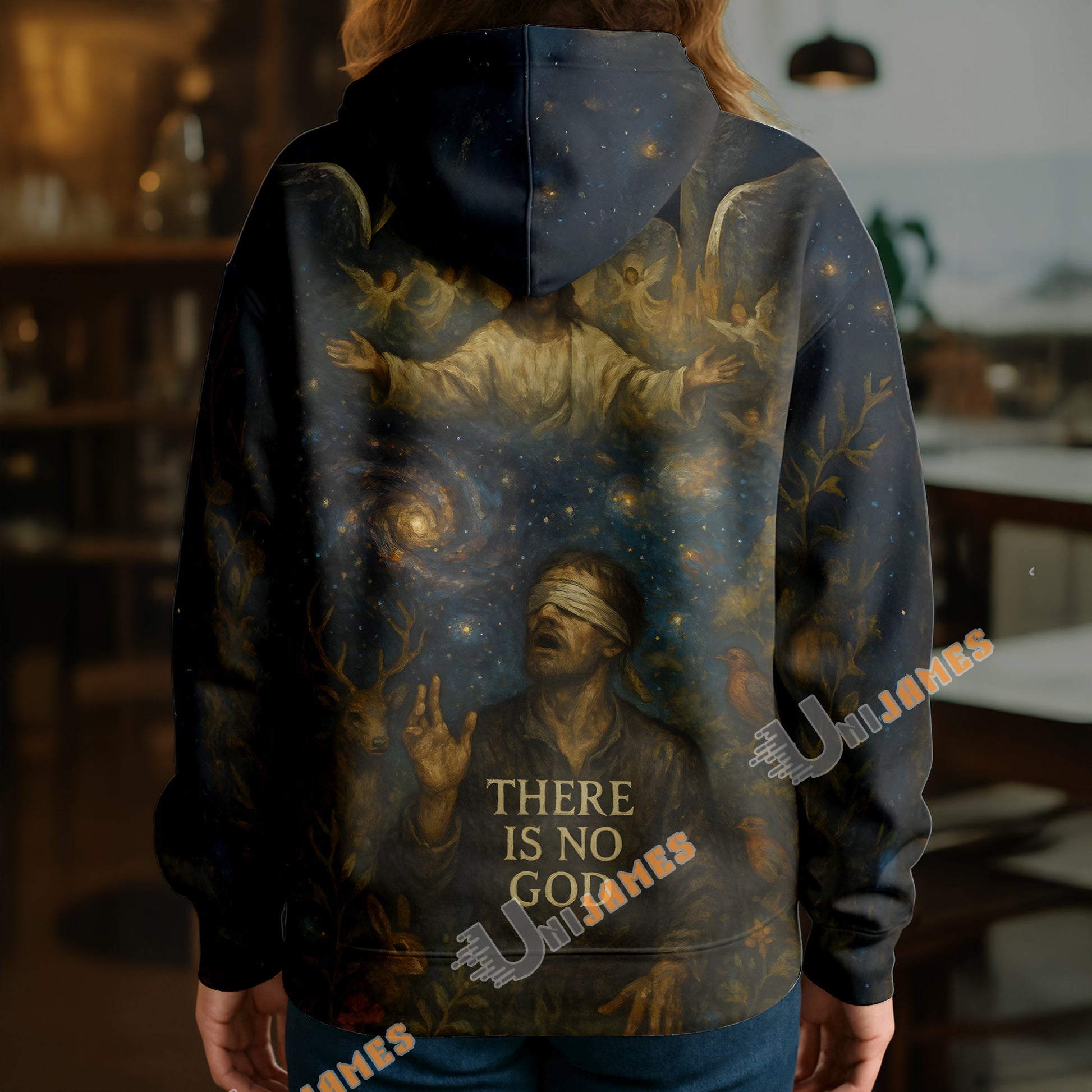 Embrace bold irony with our "There Is No God" Hoodie. Featuring a stunning cosmic print of ethereal angels, a radiant Jesus figure, and a blindfolded seeker amid galaxies and nature motifs. Crafted from soft, premium fleece for ultimate comfort.