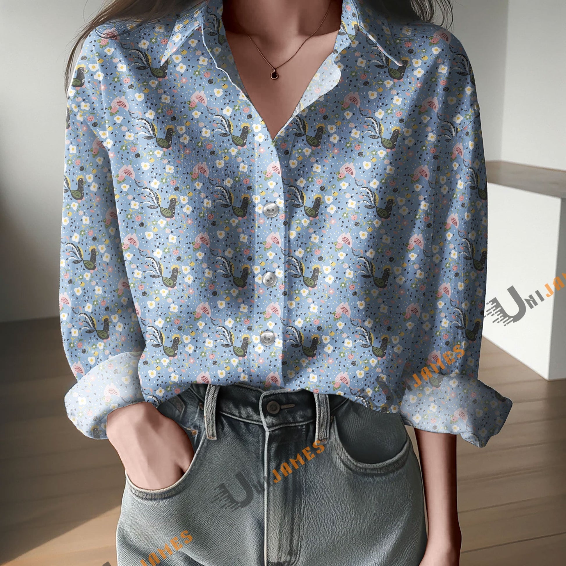 Unique Chicken Gallito Pinto Light Blue Print Casual Long Sleeve Comfortable Shirt