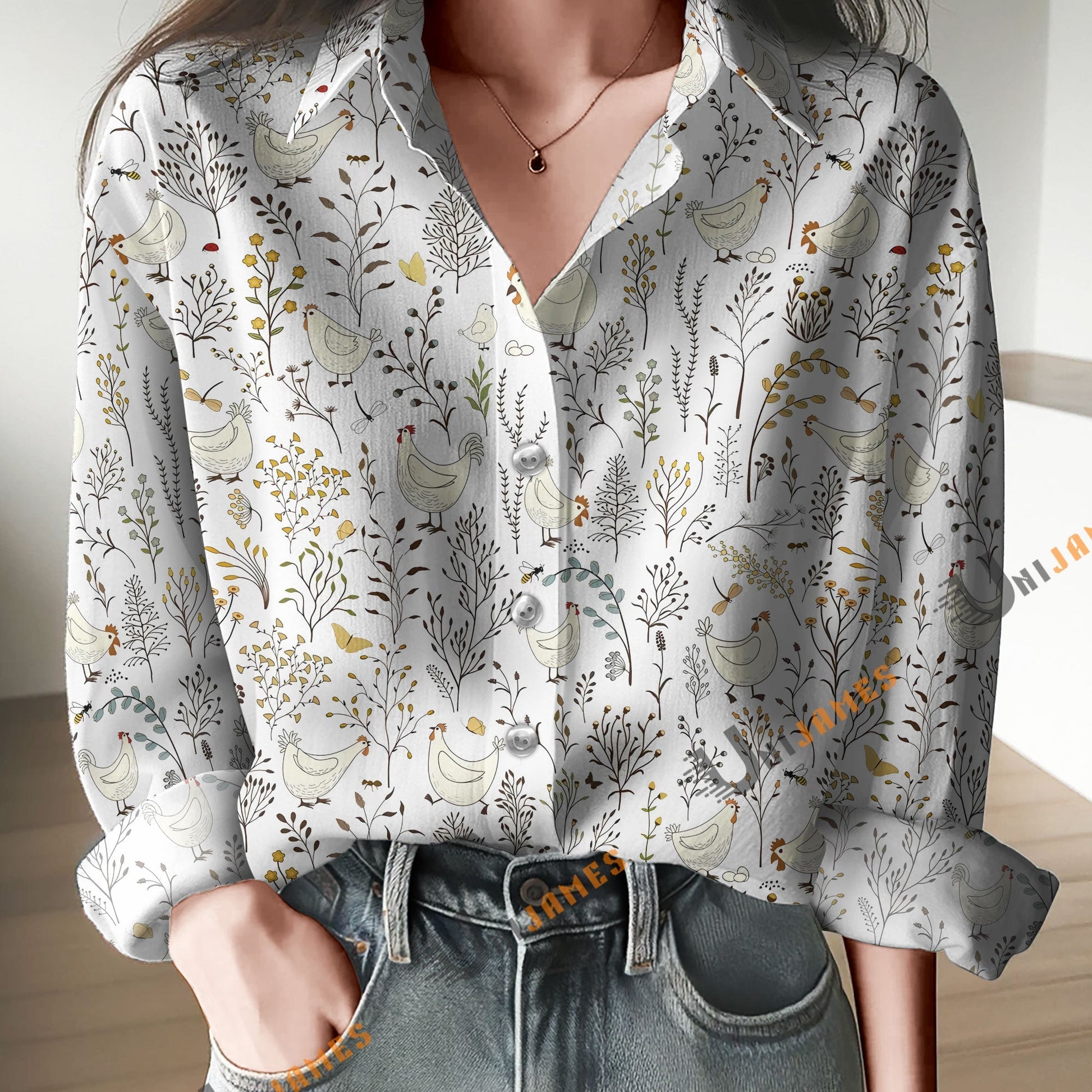 Unique Chickens In The Garden Print Casual Long Sleeve Comfortable Shirt