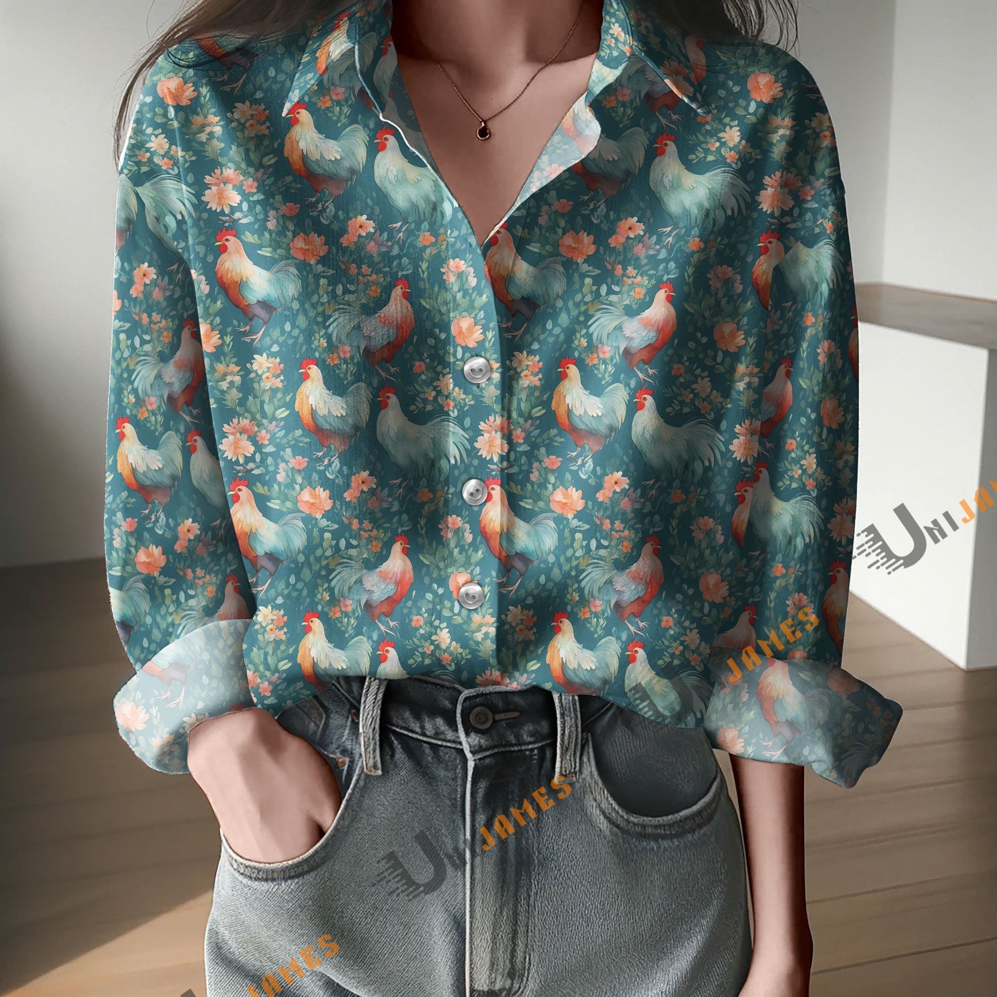 Unique Floral Chickens Hens Print Casual Long Sleeve Comfortable Shirt