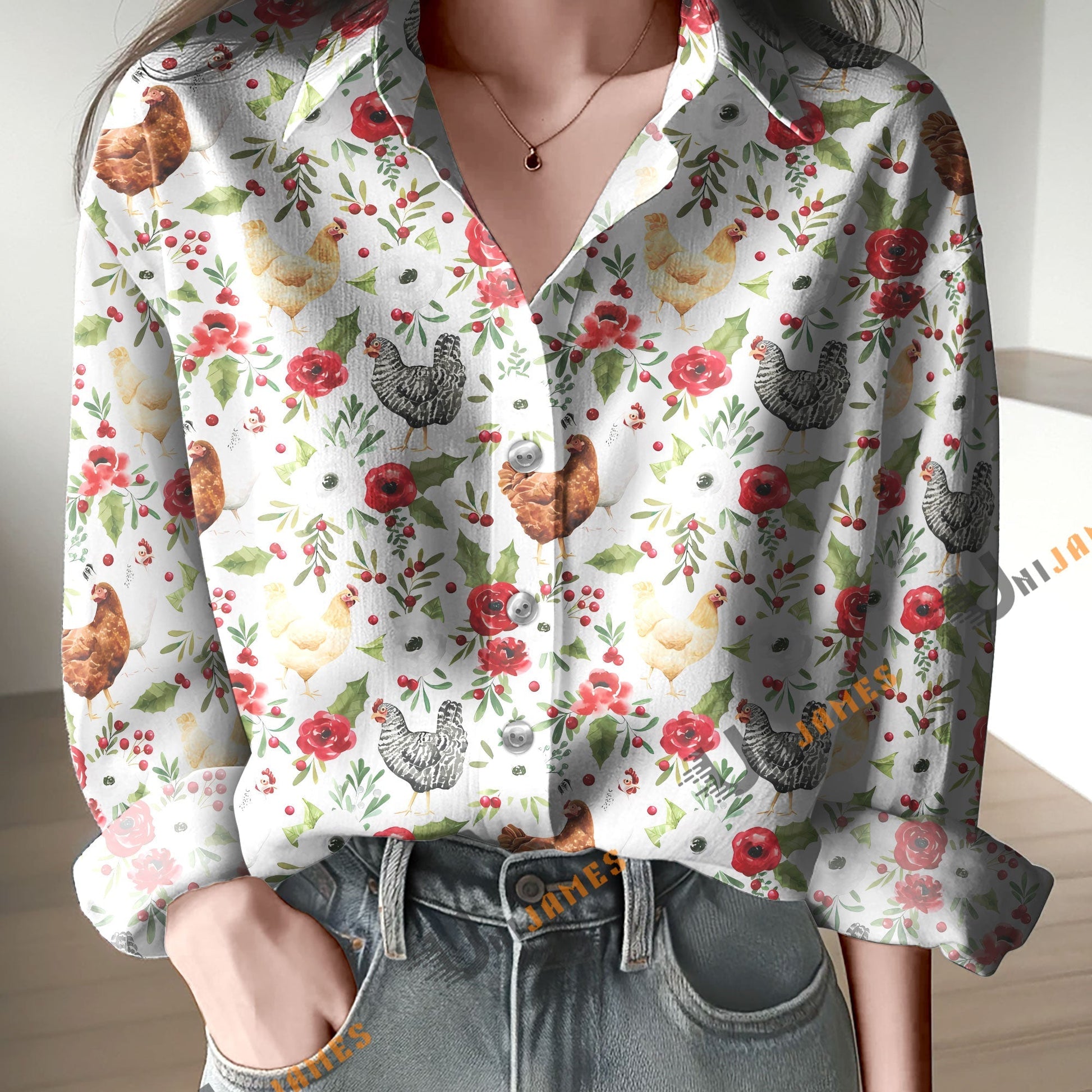 Unique Holly and Pine Christmas Chicken Floral Print Casual Long Sleeve Comfortable Shirt