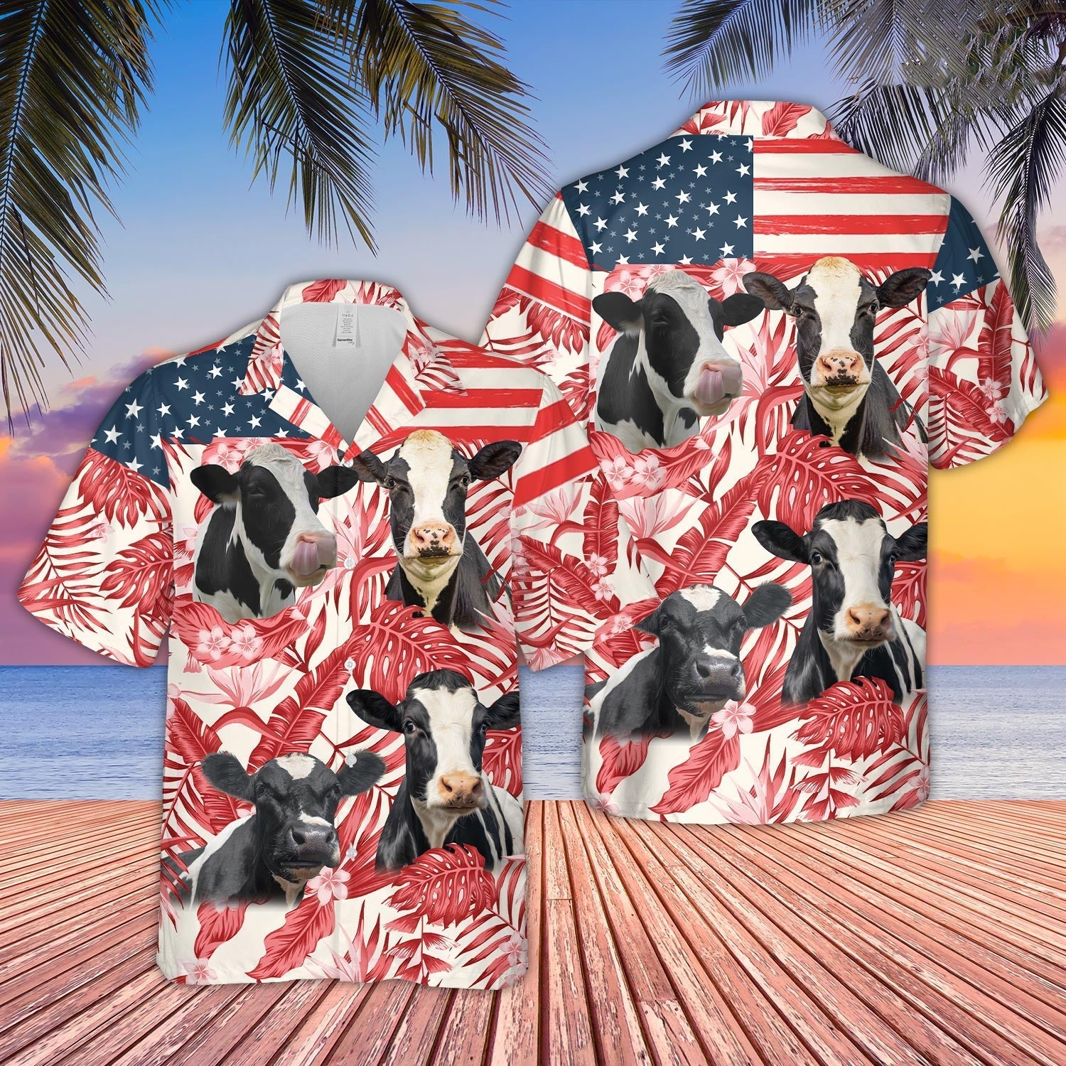 Unique Holstein Red Floral US Flag 3D Hawaiian Shirt