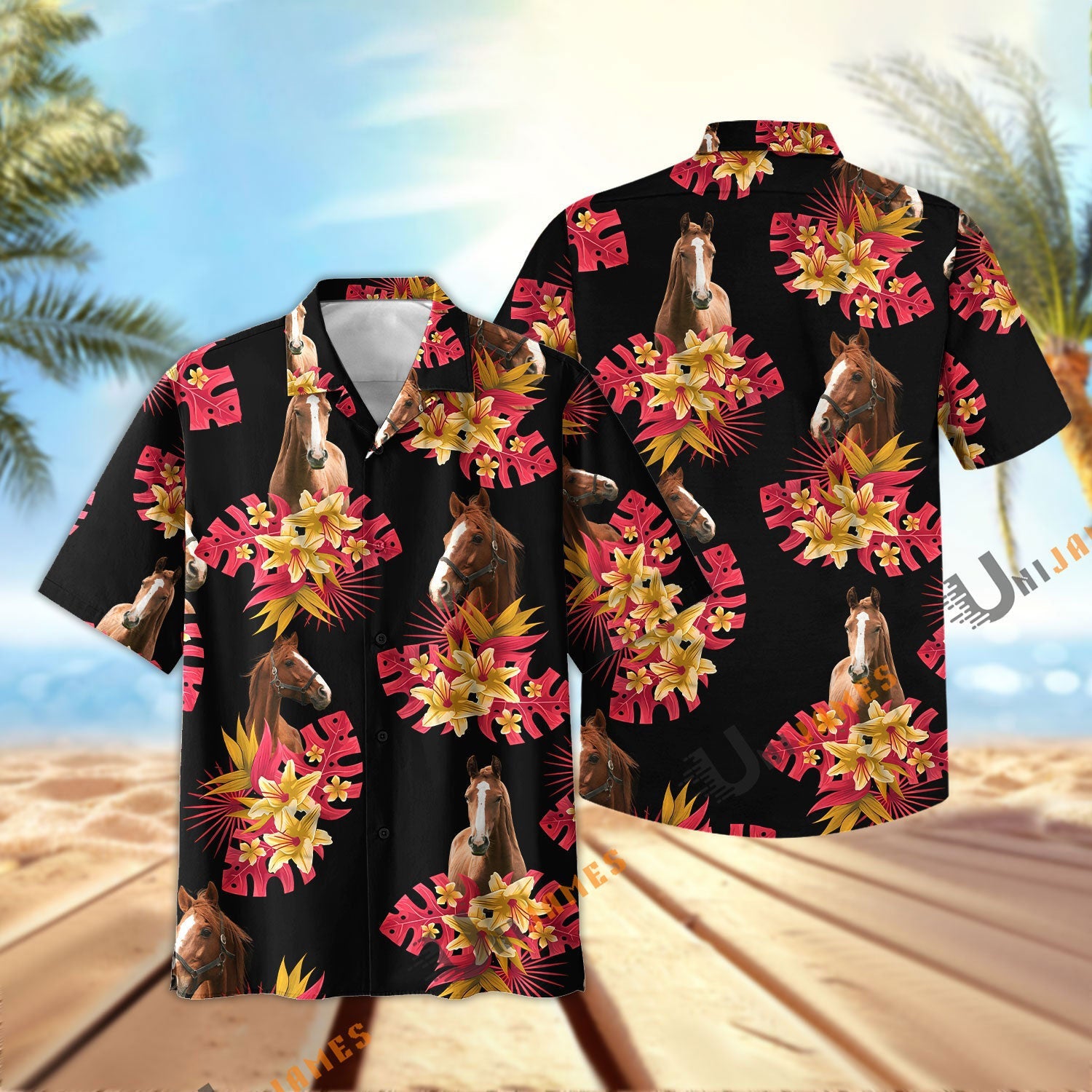 Unique Horse Black Red Flowers Pattern Hawaiian Shirt