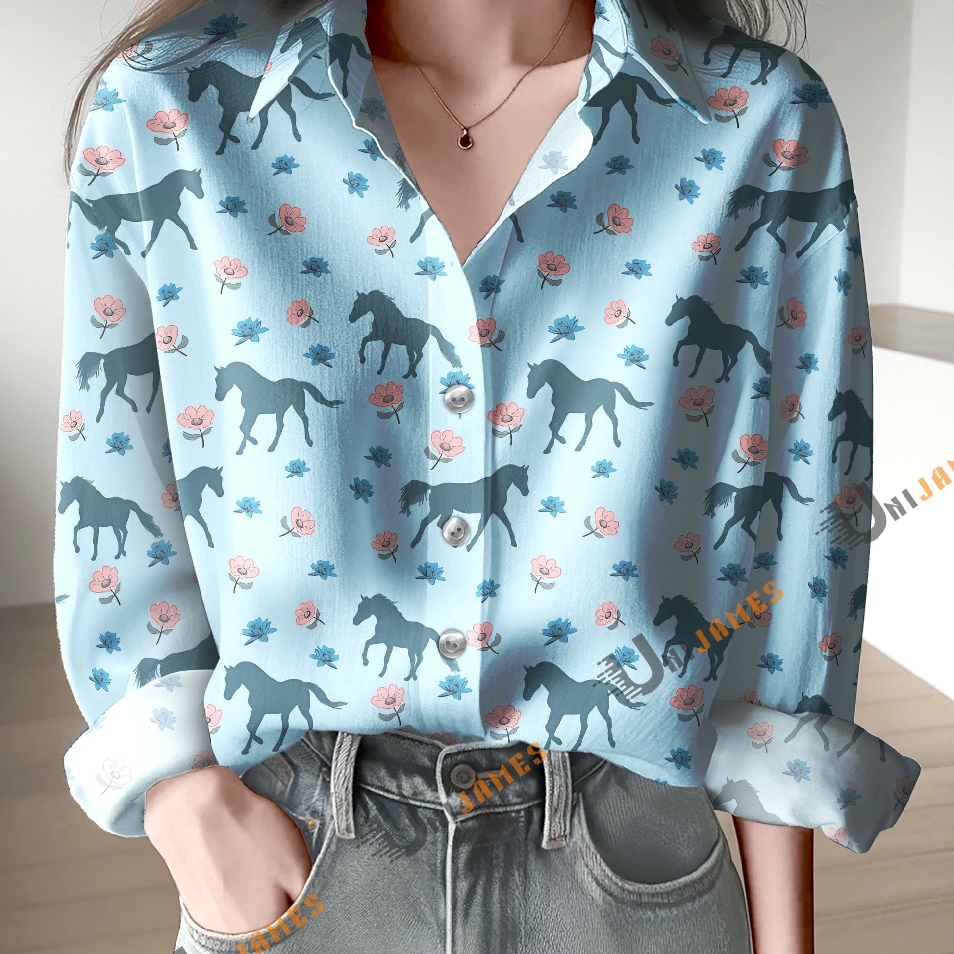 Unique Horse Flower Blue Print Casual Long Sleeve Comfortable Shirt
