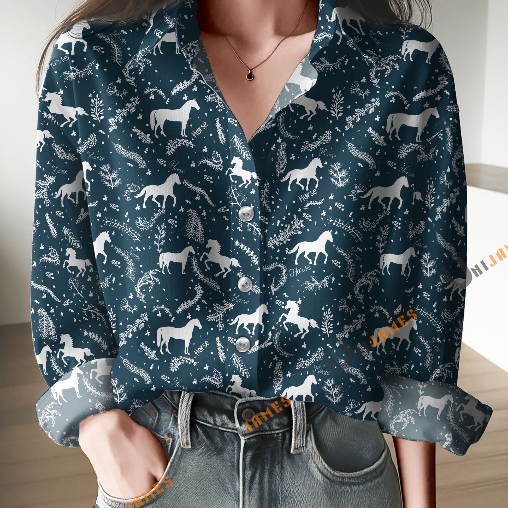 Unique Horse Navy Pattern Print Casual Long Sleeve Comfortable Shirt