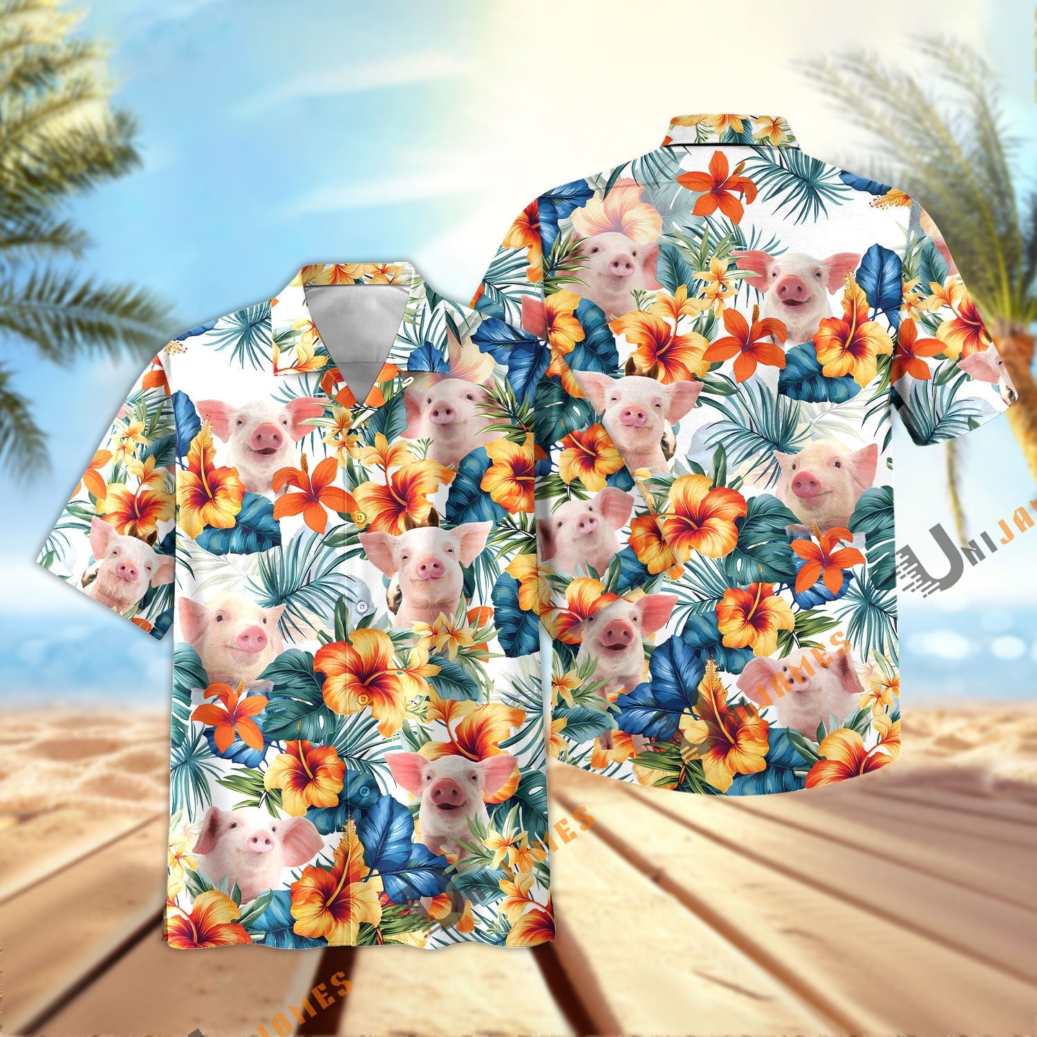 Unique Pig Colorful Summer Flowers and Leaves Hawaiian Shirt