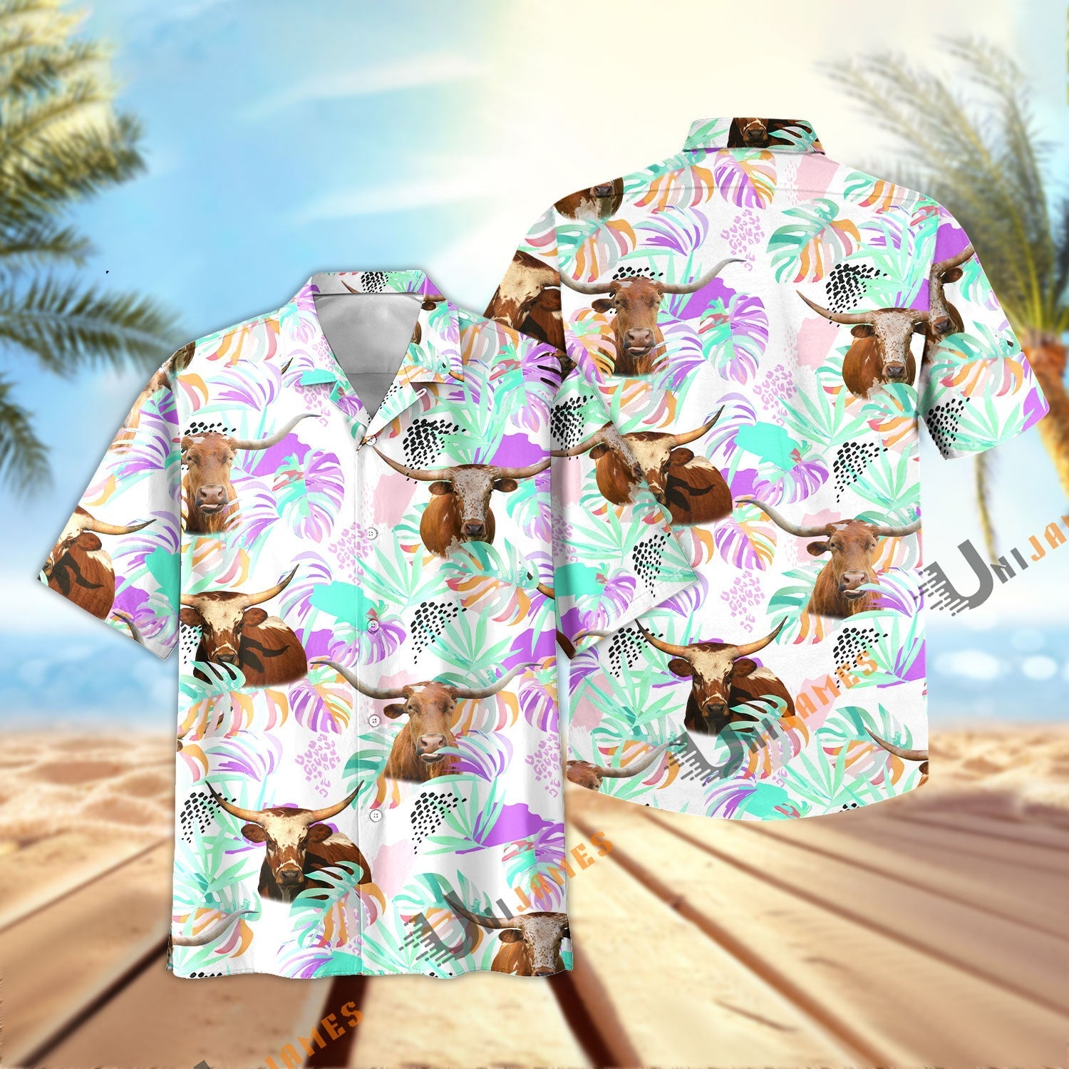 Unique Texas Longhorn Purple Tropical Pattern Hawaiian Shirt