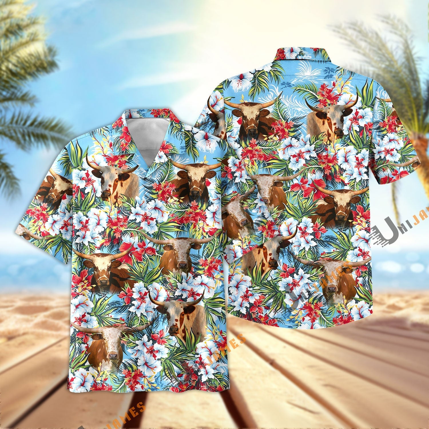 Unique Texas Longhorn Red and White Flowers 3D Hawaiian Shirt