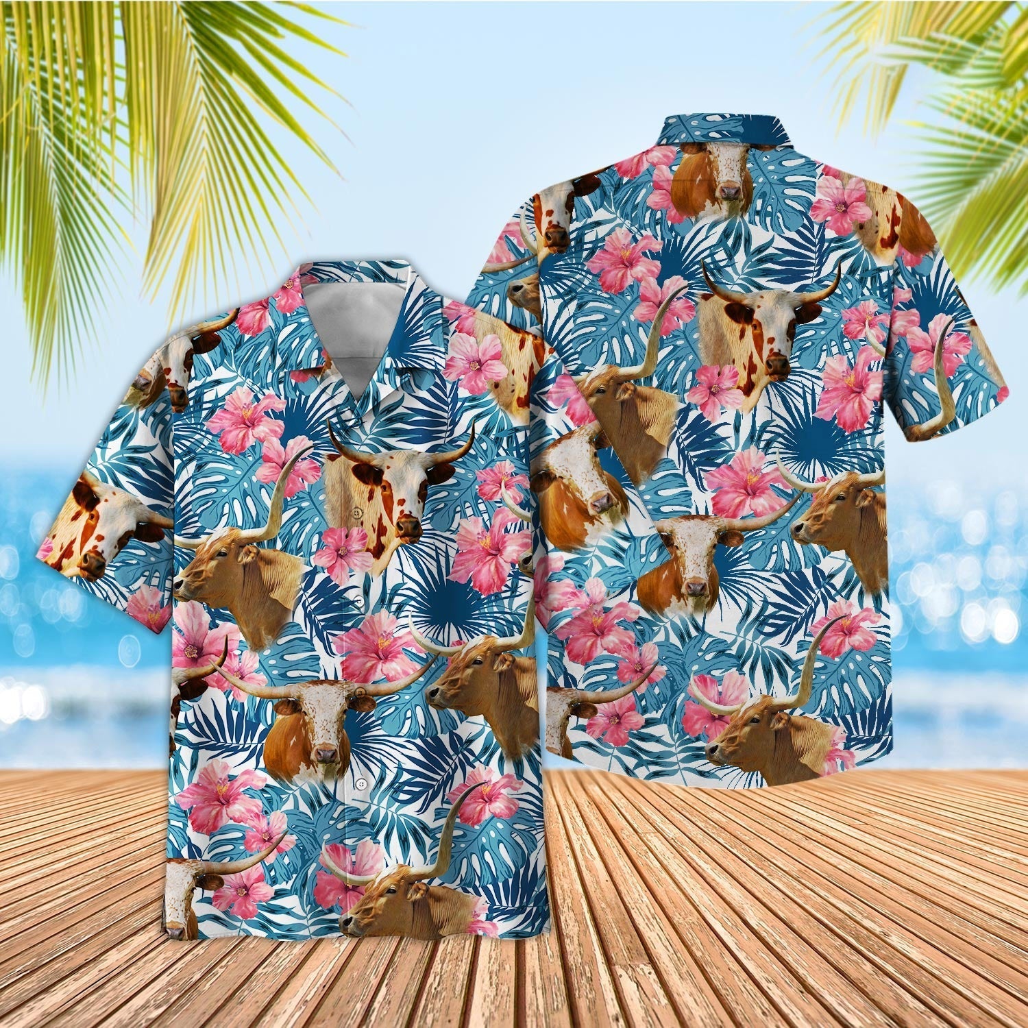 Unique Tropical Texas Longhorn Blue Pink Floral 3D Hawaiian Shirt