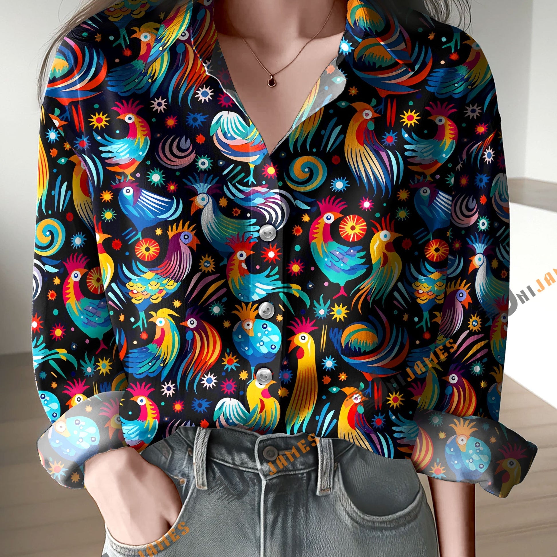 Unique Vibrant Whimsical Chickens Print Casual Long Sleeve Comfortable Shirt