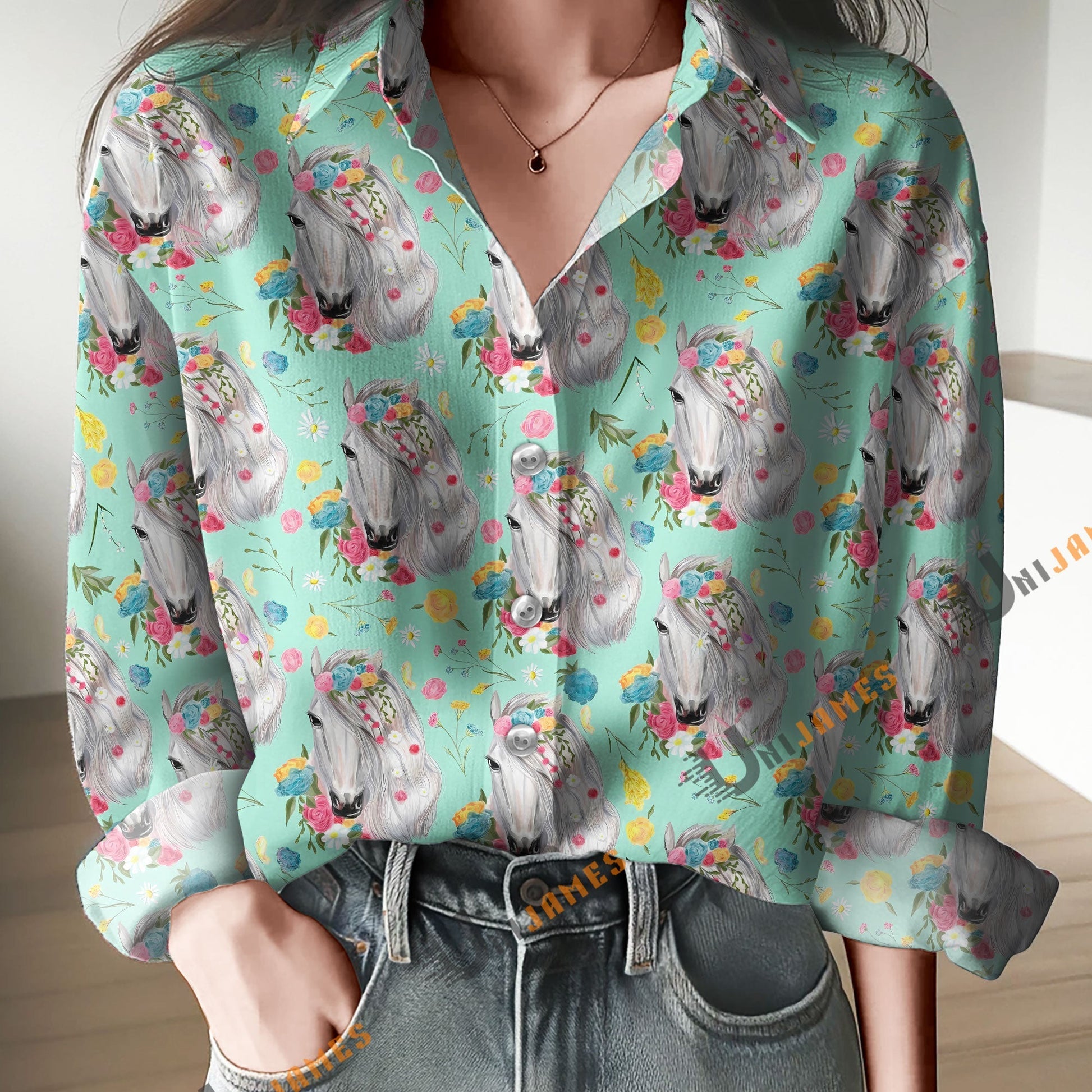 Unique Vintage Floral Horses Print Casual Long Sleeve Comfortable Shirt